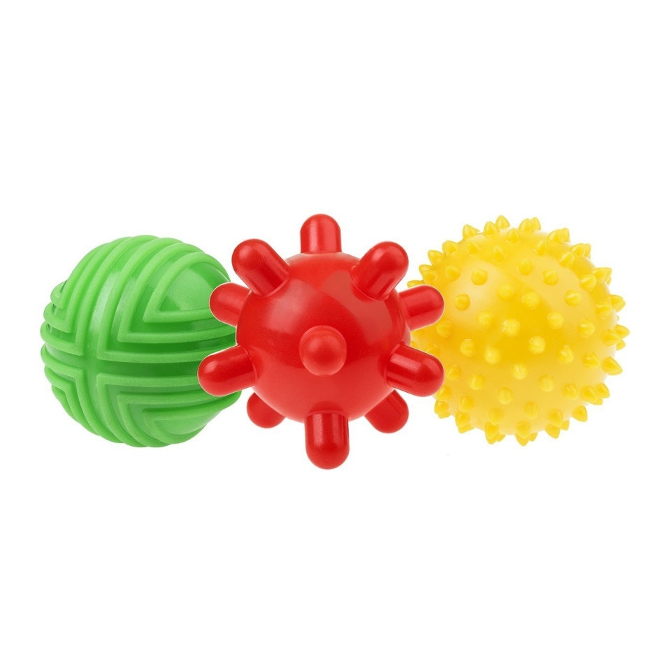 Zestaw zawiera 3 piłki sensoryczne o różnych kolorach i wypustkach.