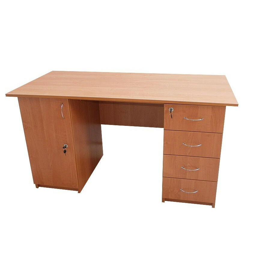 Biurko wykonane z płyty laminowanej w standardowym kolorze buk. 18mm (możliwe inne kolory do wyboru). Widoczne krawędzie zabezpieczone zostały obrzeżem PCV. Prezentowany model wyposażony jest w zamykaną szafkę w której znajduje się półka oraz 4 szuflady. Szuflady oraz szafka otwierane są za pomocą metalowych uchwytów. Szeroki blat z pewnością pozwoli na wygodną pracę oraz naukę.