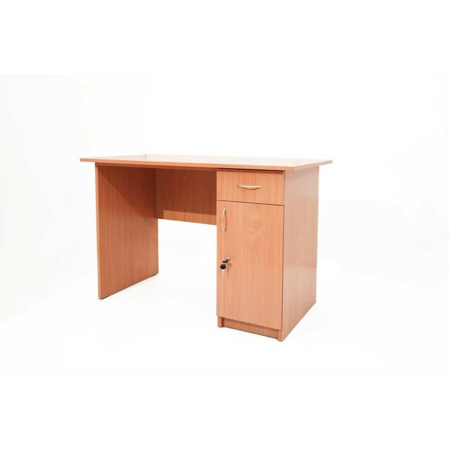 Biurko wykonane z płyty meblowej w standardowym kolorze buk gr. 18mm (możliwe inne kolory do wyboru). Widoczne krawędzie zabezpieczone zostały listwą PCV. Prezentowany model wyposażony jest w szufladę oraz zamykaną szafkę w której znajduje się jedna półka. Szuflada porusza się na prowadnicach rolkowych. Szuflada oraz szafka otwierana za pomocą metalowych uchwytów. Szeroki blat z pewnością pozwoli na wygodną pracę oraz naukę.