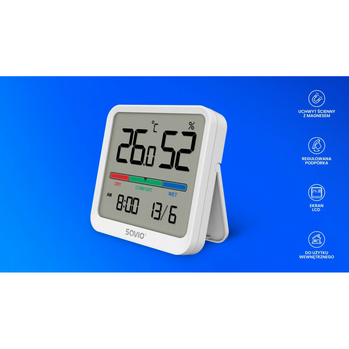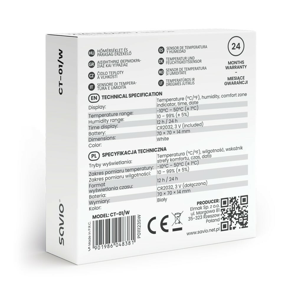 Czujnik CT-01/W marki Savio jest urządzeniem do pomiaru, które umożliwia śledzenie temperatury oraz wilgotności wewnątrz pomieszczenia. Jest to przydatne m.in. przy magazynowaniu żywności, dbaniu o rośliny, nadzorowaniu procesów wytwarzania w magazynach czy też w efektywnym zarządzaniu energią.