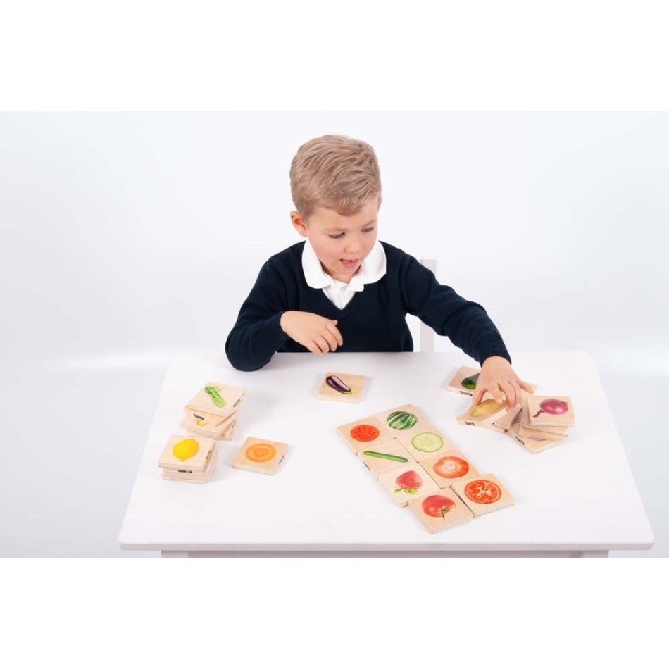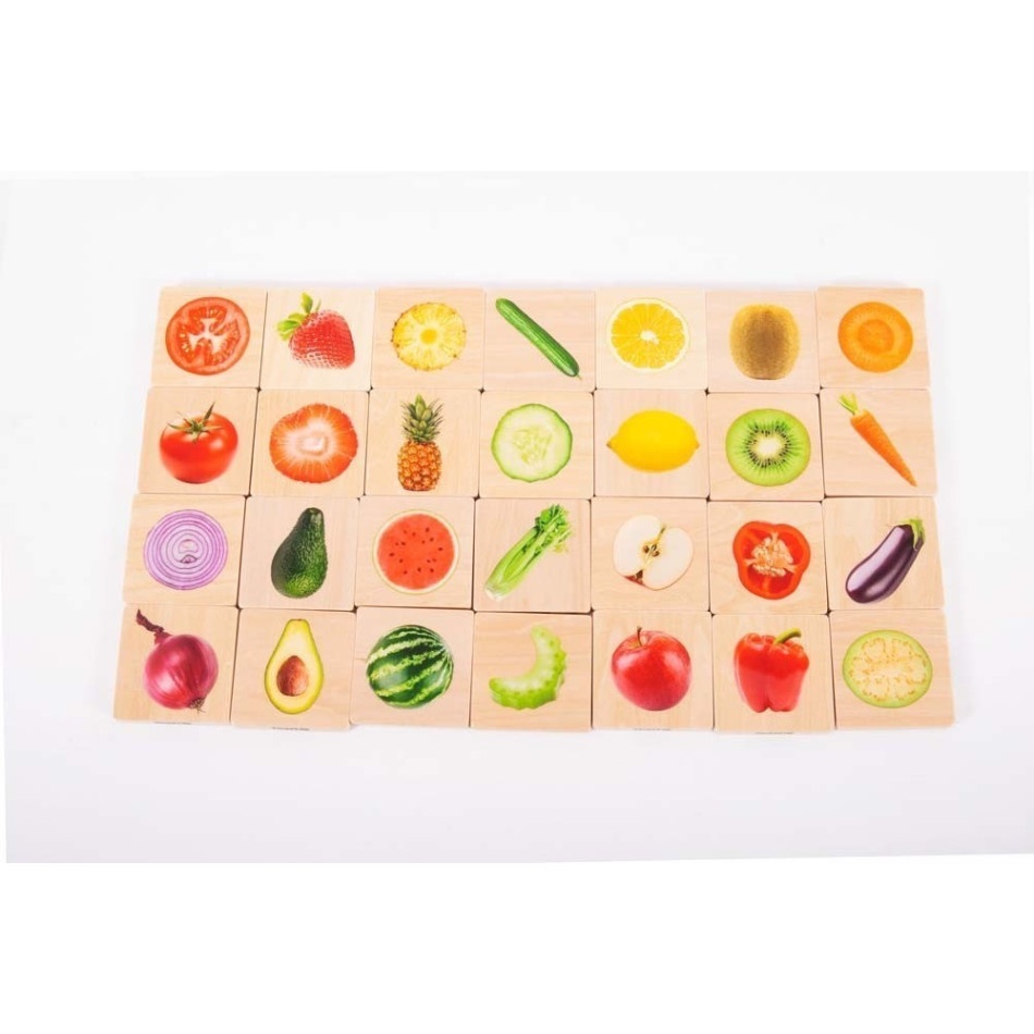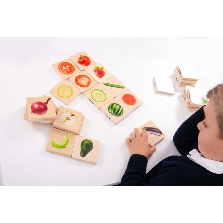 2. Jako gra pamięciowa – odwróć wszystkie płytki i spróbuj zapamiętać, gdzie znajdują się pasujące pary owoców lub warzyw.