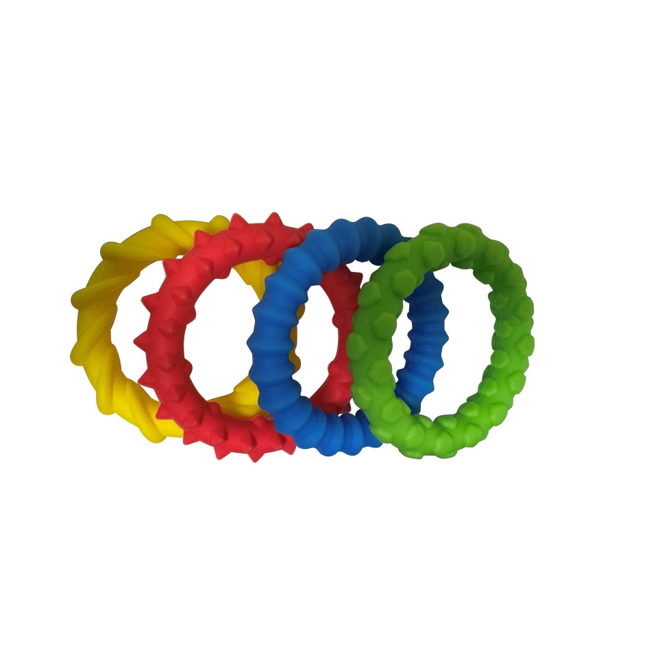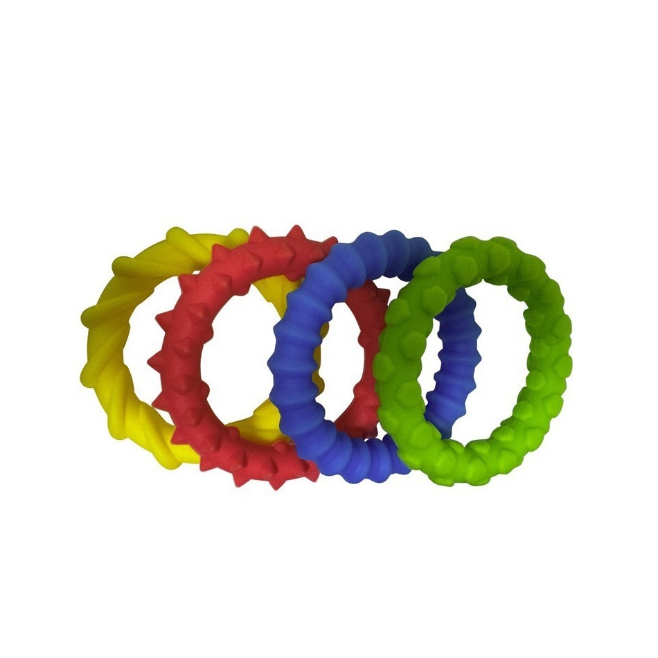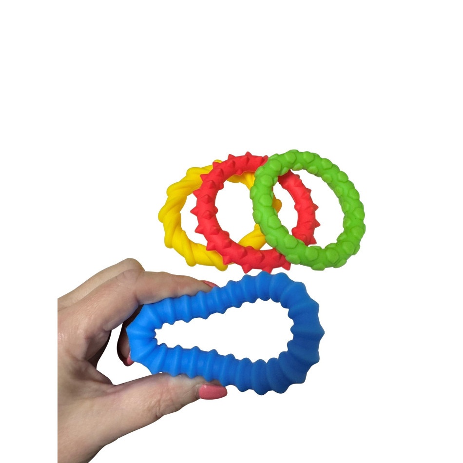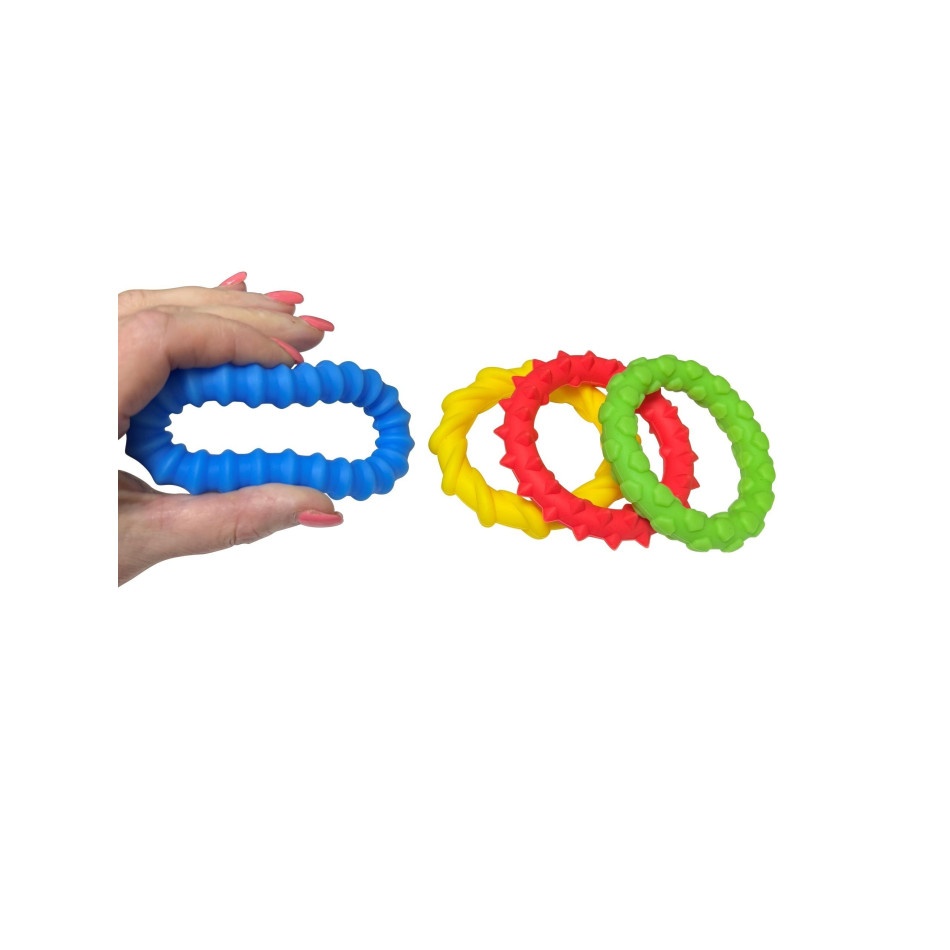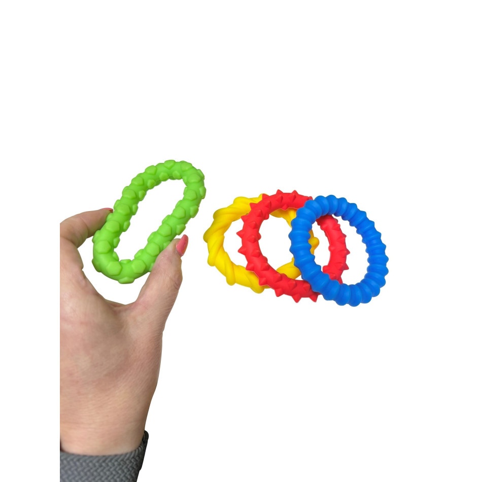 Zestaw 4 elastycznych, miękkich pierścieni o zróżnicowanych teksturach i intensywnych kolorach. Idealne do stymulacji dotykowej, zabawy antystresowej i wsparcia sensorycznego. Ciche, lekkie i wygodne – sprawdzą się w klasie, pokoju sensorycznym i w podróży.