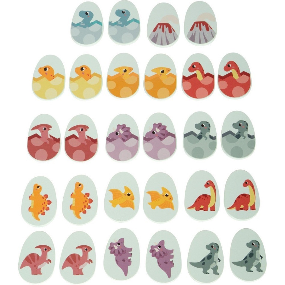 • Drewniane memo z dinozaurami zawiera 14 solidnych elementów w kształcie jajek dinozaurów z kolorowymi, przyjaznymi wzorami.