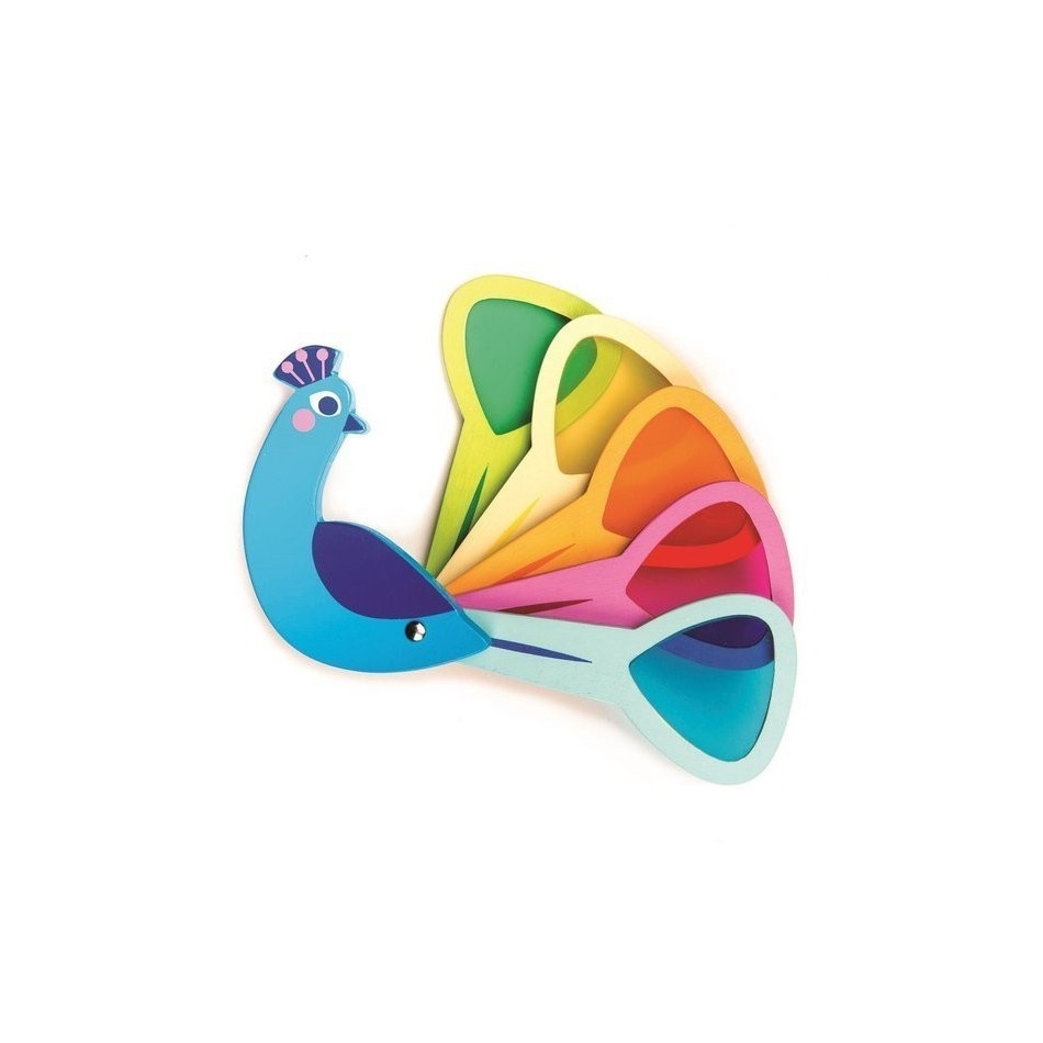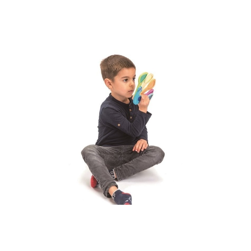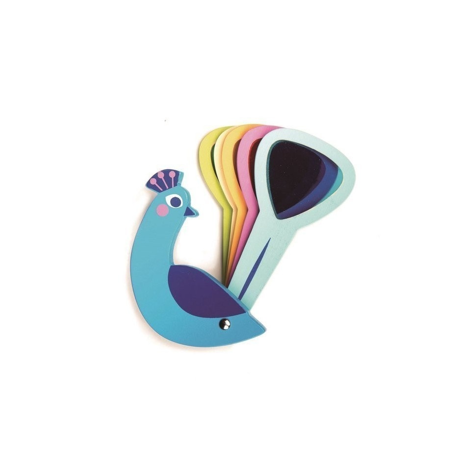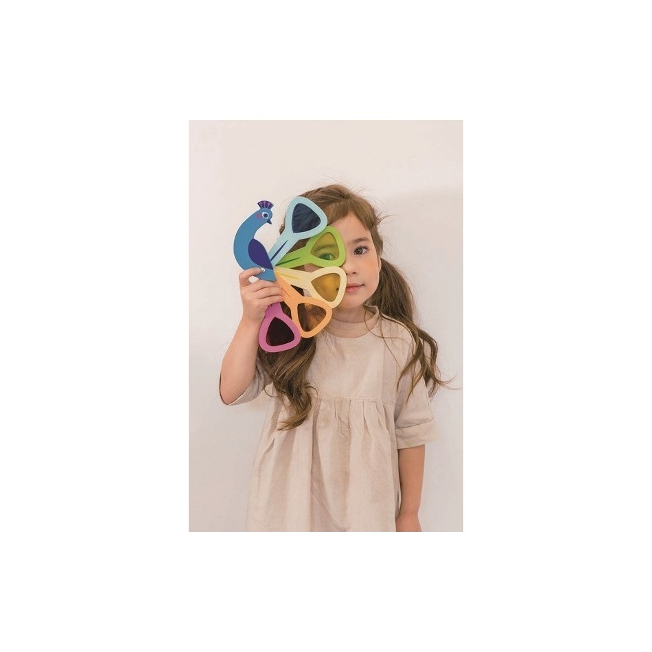 Zaglądaj przez ruchome pióra pawia, wyposażone w kolorowe szybki, i zobacz, jak świat zmienia się w magiczne mozaiki kolorów! Eksperymentuj, patrząc przez 2 lub 3 szkiełka jednocześnie, aby odkrywać nowe odcienie i efekty. Ta wyjątkowa zabawka optyczna nie tylko bawi, ale też rozwija wyobraźnię oraz ułatwia naukę rozpoznawania i łączenia kolorów.