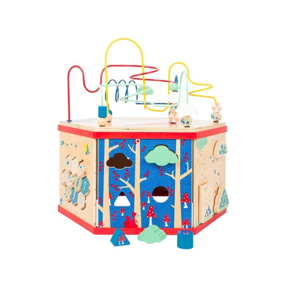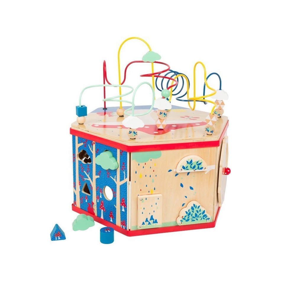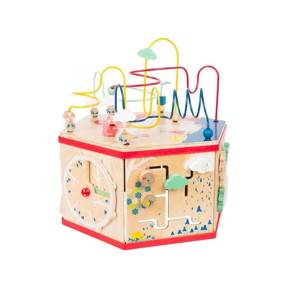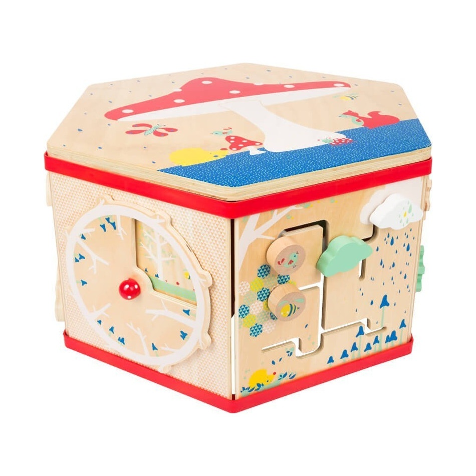 Ta wysokiej jakości kostka motoryczna wykonana w 100% z certyfikowanego drewna FSC® przekonuje ze wszystkich stron wysoką wartością zabawy, ponieważ jest tak wiele do odkrycia dla małych odkrywców: składane drewniane plansze w stylu memo trenują zmysł liczbowy, gra w wyszukiwanie z jeżem, biedronką i ptakiem zapewnia zabawę, a zegar sezonowy ujawnia ciekawe fakty na temat wiosny, lata, jesieni i zimy. Gra w koła z trybikami i labirynt uzupełniają świat umiejętności motorycznych. Duża pętla motoryczna na zdejmowanej pokrywie wieńczy zabawę. Atrakcja: Kostka do ćwiczeń motorycznych służy również jako stołek lub stolik!
