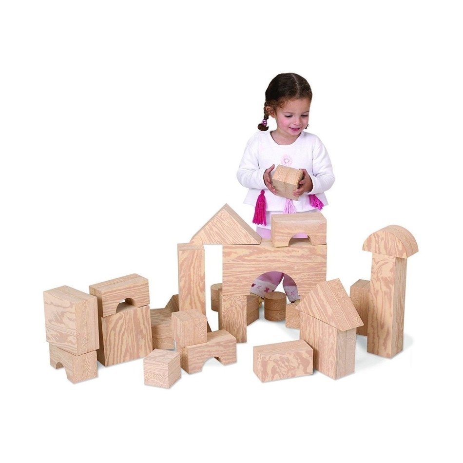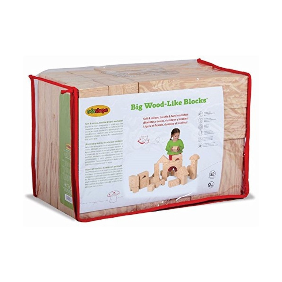Klocki drewnopodobne, ogromne, ponadgabarytowe (prawie 8 cm grubości) miękkie, które wyglądają jak prawdziwe drewno. Tak samo zabawne, jak ich klasyczne odpowiedniki z prawdziwego drewna, ale wystarczająco bezpieczne nawet dla 9 miesięcznego dziecka. Nie ma drzazg, nie ma ciężkich klocków, ostrych drewnianych narożników, które mogłyby zranić, duże rozmiary bloków ułatwiają chwytanie nawet dla małych rączek lub rąk wymagających szczególnej uwagi, 32 sztuki klocków w zestawie.