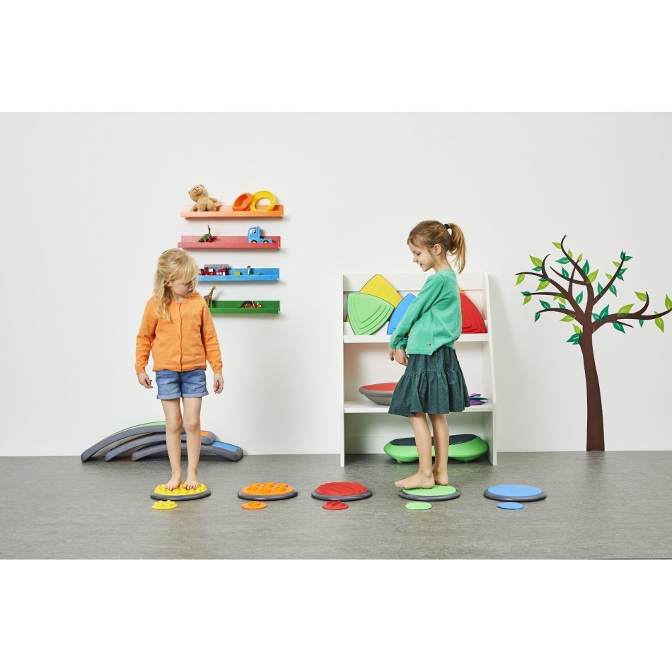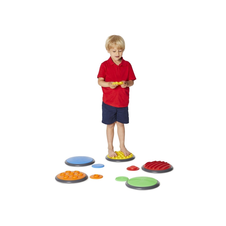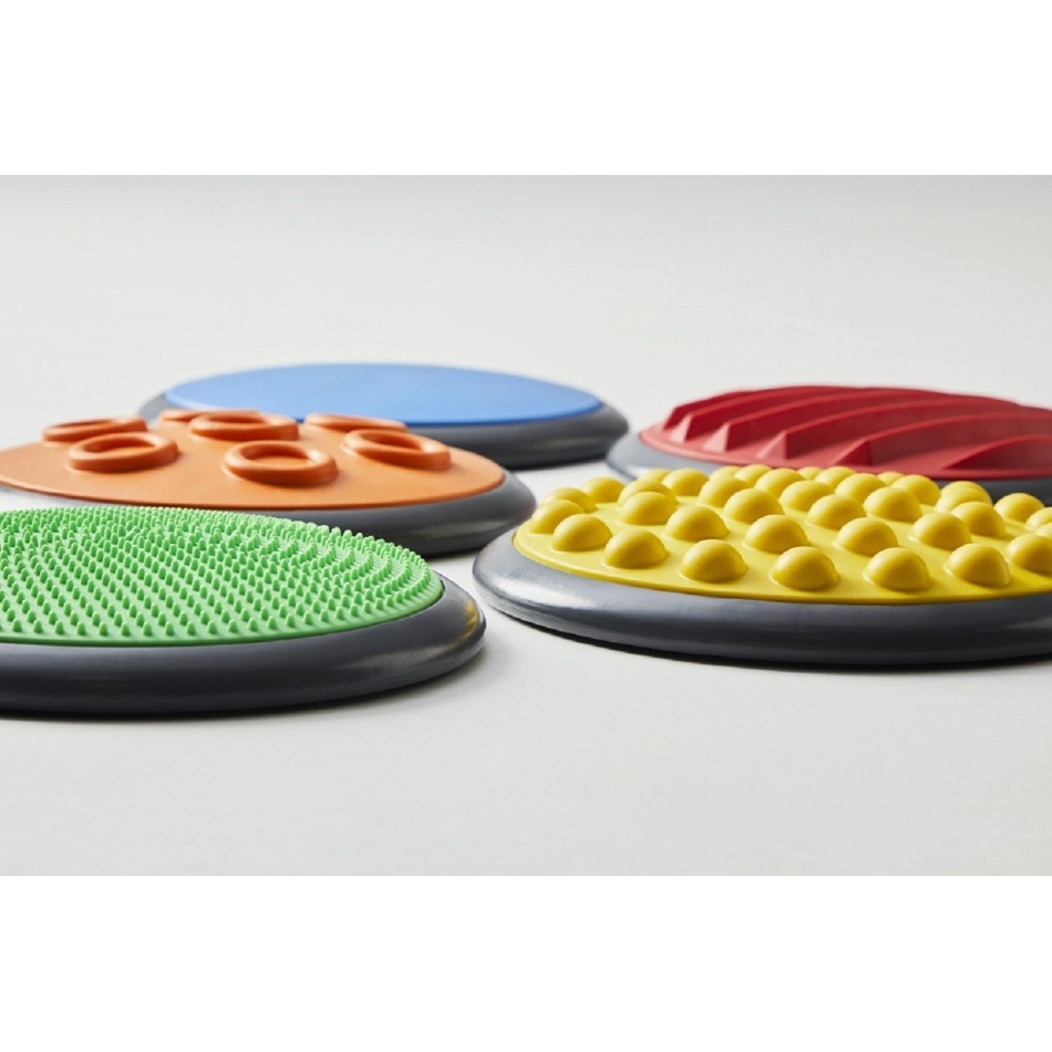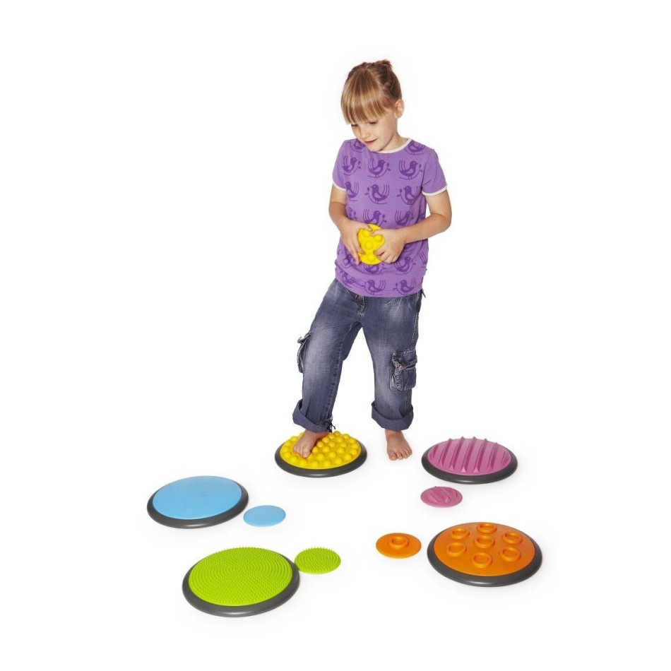 Zestaw zawiera 5 małych i 5 dużych dysków wykonanych z przyjemnej w dotyku gumy. Elementy mają różne faktury i kolory. Zabawa dyskami ćwiczy zmysł dotyku, rozwija zdolność opisywania wrażeń dotykowych, może służyć do masażu stóp i dłoni, a także do gier zespołowych. Dyski pakowane są w woreczki.