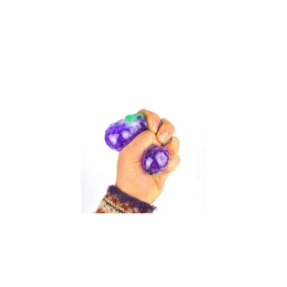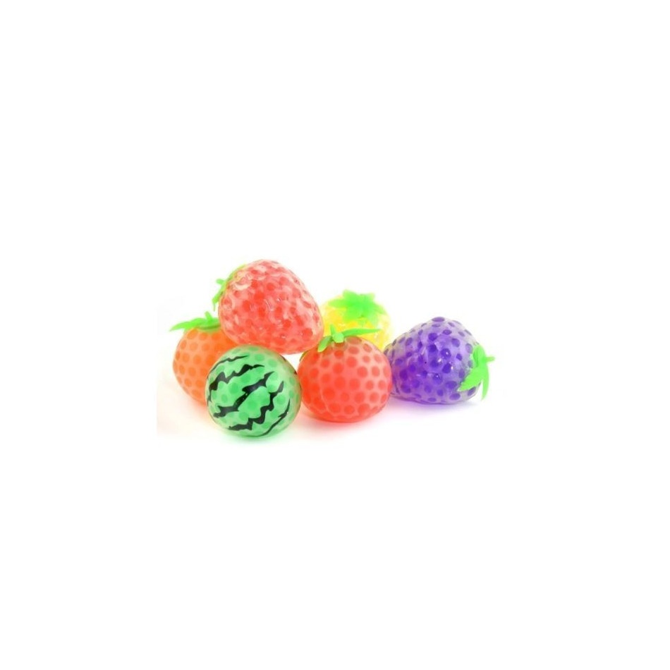 Miękki, rozciągliwy gniotek w kształcie owocu z żelowymi kuleczkami w środku.