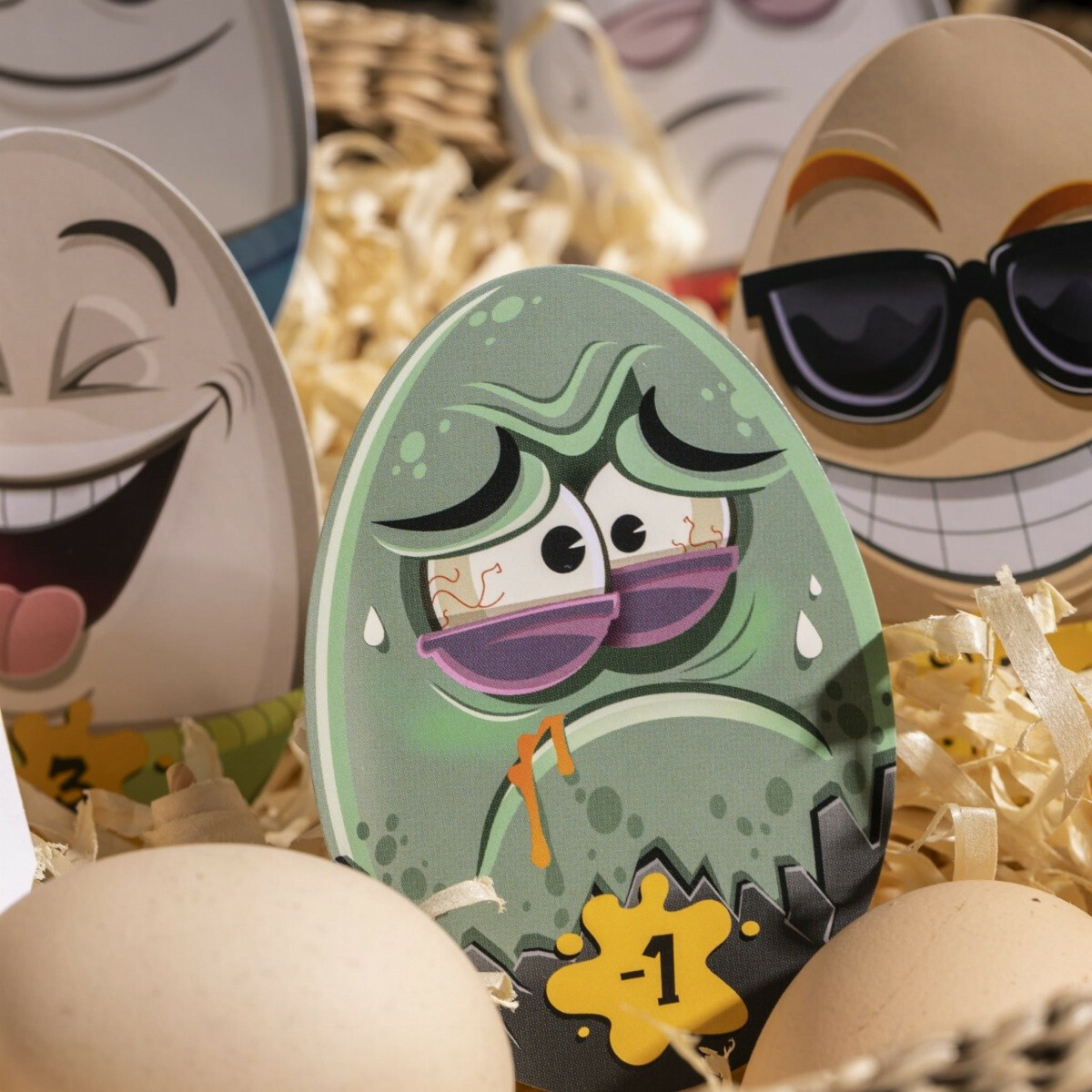 Szybka gra karciana pełna niespodziewanych zwrotów akcji! W grze kolejno zagrywacie karty w taki sposób, żeby na koniec rozgrywki to właśnie w waszym niewidocznym pudełku znalazły się jajka z największą sumą punktów. W trakcie gry zachowajcie czujność, pozostali gracze będą próbować podebrać wam wasze najlepsze jajka lub podrzucić do waszego pudełka zgniłe jaja, które mają punkty ujemne!