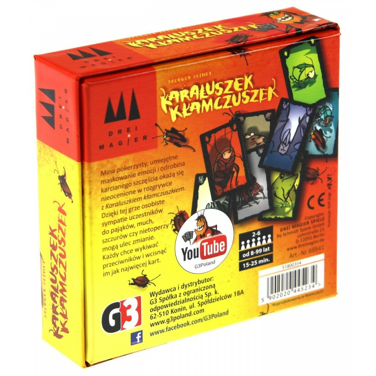Mina pokerzysty, umiejętne maskowanie emocji i odrobina karcianego szczęścia okażą się nieocenione w rozgrywce z Karaluszkiem kłamczuszkiem. Dzięki tej grze osobiste sympatie uczestników do pająków, much, szczurów czy nietoperzy mogą ulec zmianie. Każdy chce wykiwać przeciwników i wcisnąć im jak najwięcej kart. Nigdy nie wiadomo czy współgracze mówią prawdę czy są kłamczuchami!