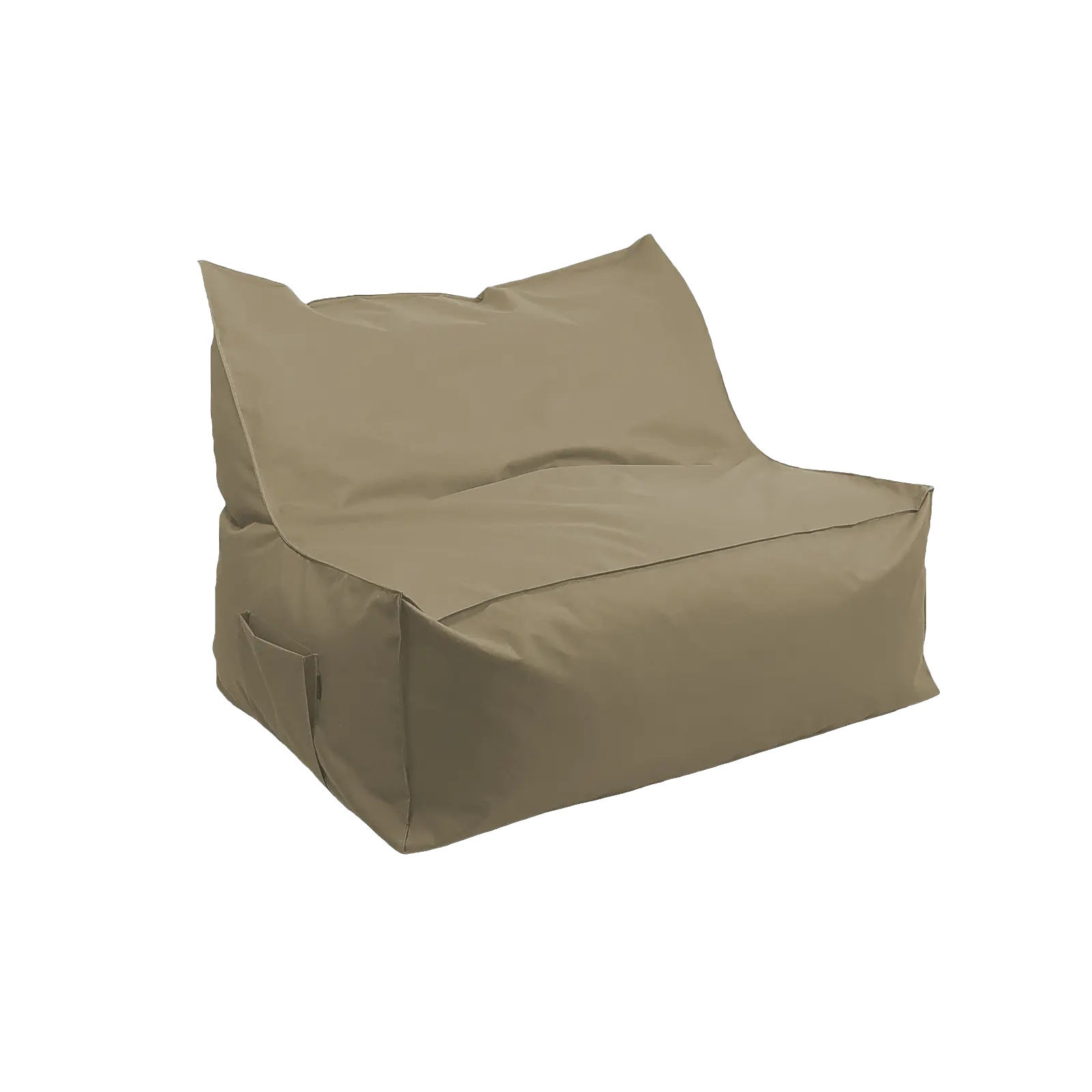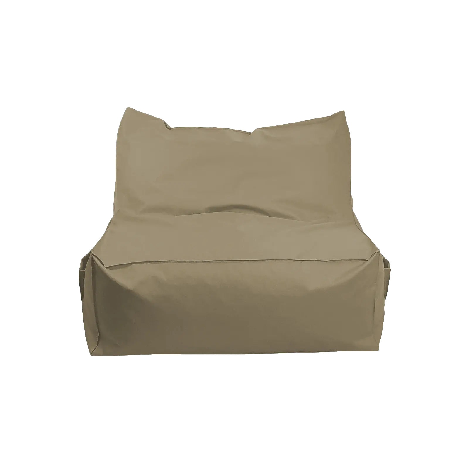 • Kanapa-pufa z oparciem wykonana z trwałej tkaniny kaletniczej (kodura) o beżowym kolorze.
