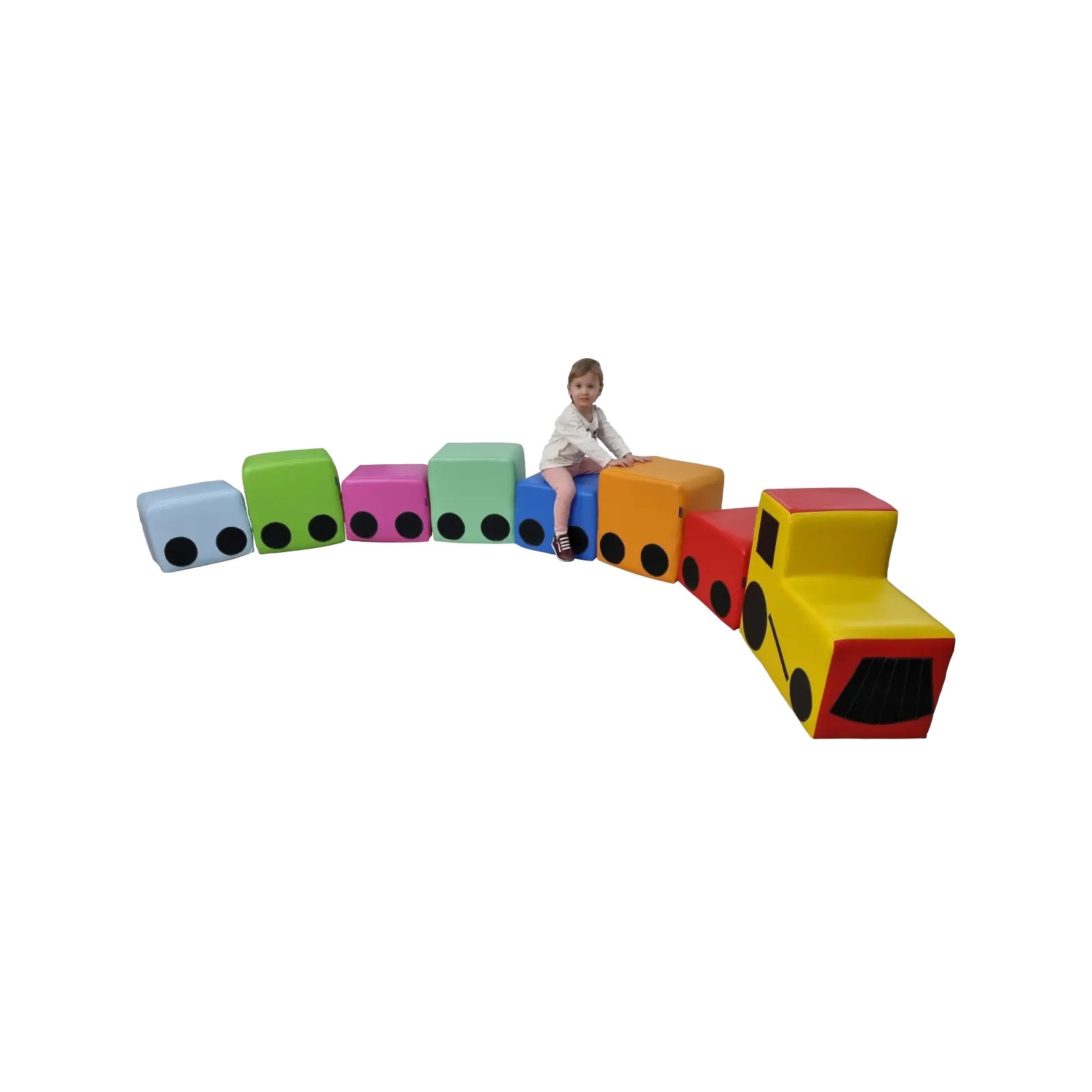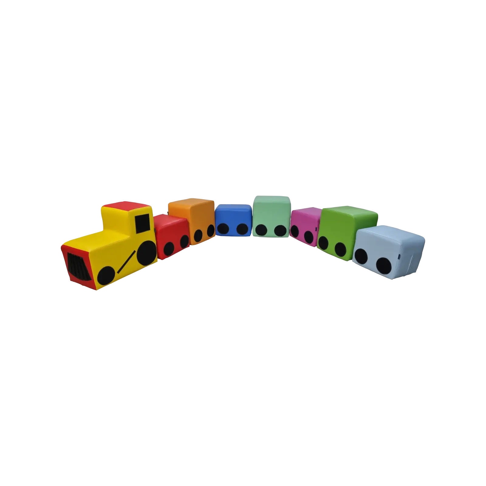 Kolorowy pociąg – zestaw kształtek rehabilitacyjnych to wygodne siedziska dla najmłodszych, mogą być wykorzystane do siedzenia lub przy składaniu różnych zestawów wypoczynkowych, kącików czytelnika w miejscach przeznaczonych do odpoczynku albo zabawy dla dzieci. Pokrowce wykonane są z wysokiej jakości materiału z powłoką PCV wolnym od ftalanów oraz stosowanym dla wyrobów medycznych, dzięki czemu jest bardzo łatwy w czyszczeniu oraz dezynfekcji. Produkt oferowany jest w zestawie.