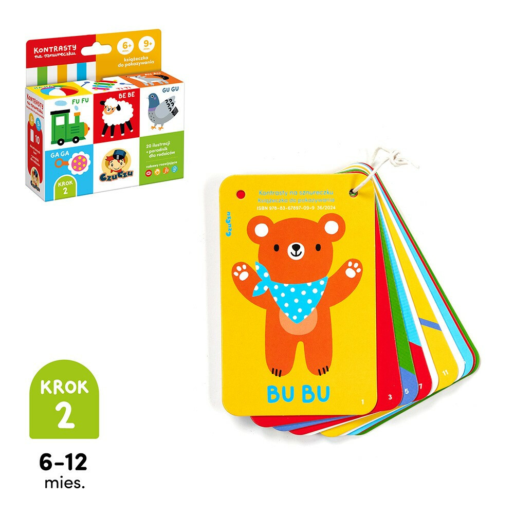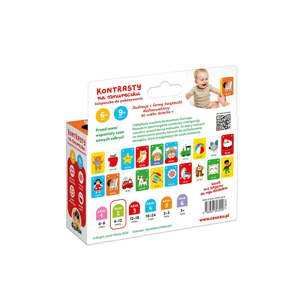Hej, maluchy i rodzice! Mamy świetne pomysły na zabawy ze starszym niemowlakiem: oglądajcie, czytajcie, słuchajcie, mówcie, pokazujcie i odkrywajcie razem świat! Książeczka do pokazywania Kontrasty na sznureczku dla dzieci w wieku 6-9 miesięcy to książeczka, która pozwoli Wam w wyjątkowo przyjemny sposób spędzać razem czas i zainspiruje do mnóstwa zabaw.