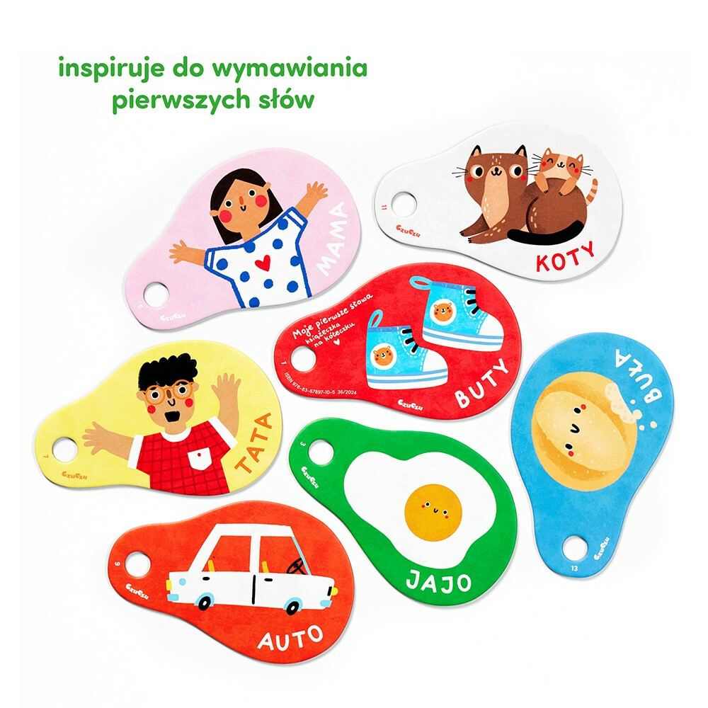 Ilustracje i opisujące je wyrazy dopasowaliśmy do zainteresowań i możliwości maluchów. Wyraźnie wymawiaj pierwsze proste słowa złożone z dwóch otwartych sylab. Poproś dziecko, by je powtarzało.