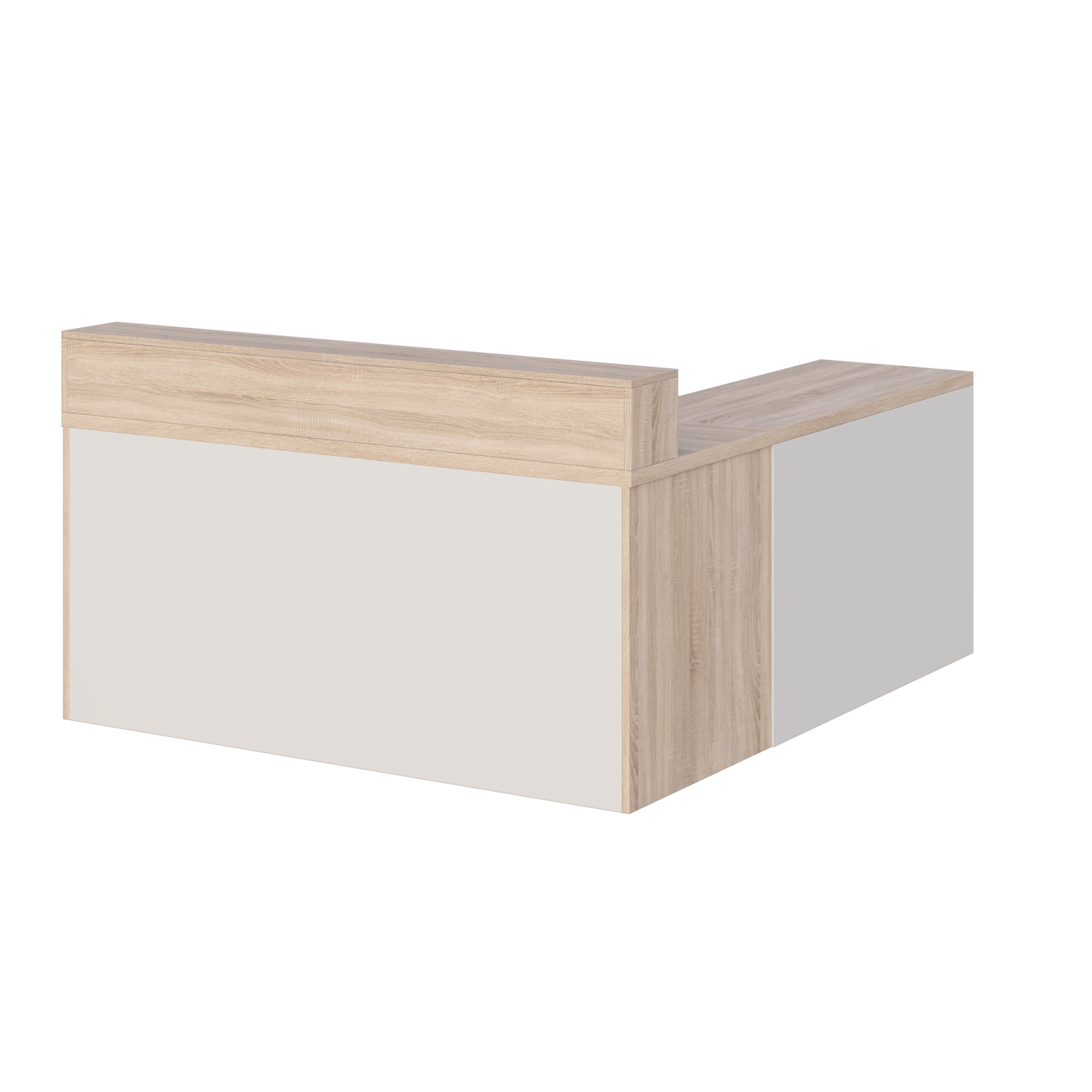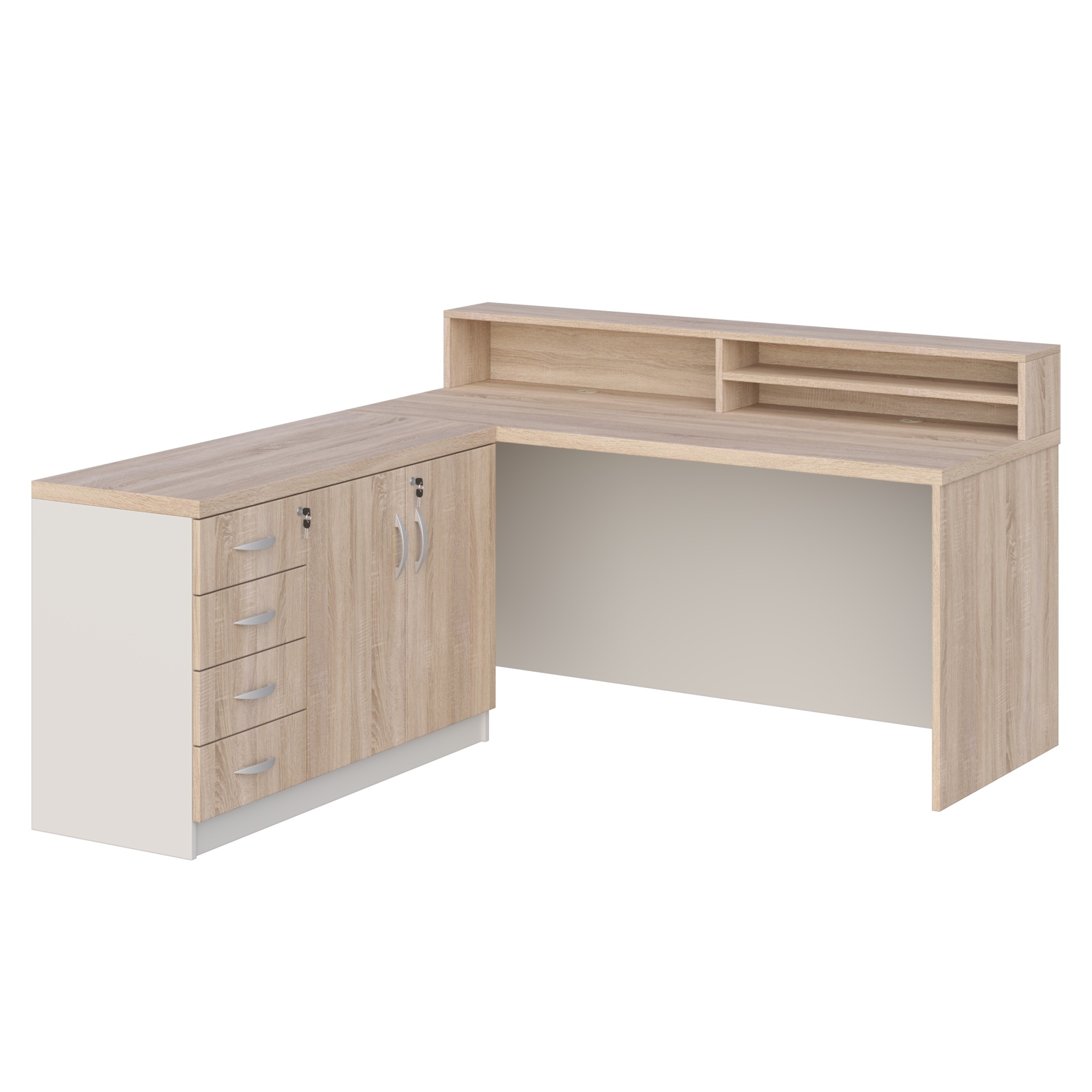 - Biurko i komoda mają zabudowany przód i tył, co umożliwia wykorzystanie mebli jako recepcji lub wolnostojących elementów wyposażenia.