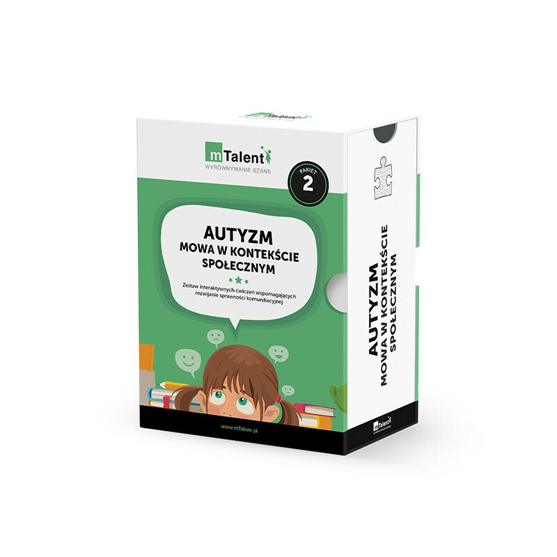 Jest autonomiczną kontynuacją programu Autyzm. Mowa w kontekście społecznym cz. 1 zawierającego ćwiczenia interaktywne wspomagające rozwijanie sprawności komunikacyjnej i pragmatyczne użycie języka (LJ0042). Proponowane materiały świetnie sprawdzą się w pracy na zajęciach logopedycznych, rewalidacyjnych i terapii pedagogicznej. Przemyślana i prosta konstrukcja ćwiczeń obejmuje obszary: zwroty grzecznościowe, tempo, fluencja mowy, intonacja, złożone wyrażenia frazeologiczne i wybrane obszary TUS (Treningu Umiejętności Społecznych). Program zawiera osobne zbiory ćwiczeń dostosowane dla dzieci nieumiejących czytać oraz dla uczniów starszych, w przypadku których zadania zawierają tekst pisany. Jest również dopełnieniem ćwiczeń z innych programów serii mTalent poświęconych całościowym zaburzeniom rozwoju. Oprogramowanie mTalent umożliwia również pracę zdalną, w tym wideokonferencje, bez konieczności korzystania z zewnętrznego oprogramowania. Został przygotowany w nowoczesnej technologii HTML5 i posłuży użytkownikom przez wiele lat. Program proponuje: ? blisko 260 ekranów interaktywnych ? zestaw materiałów dodatkowych w pudełku (np. karty pracy do wydruku, poradnik metodyczny, tradycyjne pomoce dydaktyczne) ? kurs obsługi narzędzia pozwalającego na tworzenie dodatkowych ekranów multimedialnych dla dzieci (np. większej liczby ekranów indywidualnie dostosowanych do danego dziecka, ekranów z ćwiczeniami z konkretnego obszaru lub z konkretnymi elementami graficznymi, np. z fotografiami twarzy osób znajomych dzieciom) • LICENCJA BEZTERMINOWA: 2 stanowiska online (wymagany dostęp do Internetu) oraz 2 stanowiska offline (praca bez dostępu do Internetu) • praca z programem możliwa jest zarówno offline (bez dostępu do Internetu) jak i online w każdym miejscu i czasie (szkoła, przedszkole, dom) z dostępem do Internetu • bezpłatne aktualizacje oprogramowania oraz wsparcie techniczne producenta • przeznaczony są do pracy przy użyciu komputera, tabletu, smartfona oraz tablicy lub monitora interaktywnego (na systemach Windows, Android oraz iOS). Cała seria mTalnet otrzymała wyjątkową nagrodę Logo BETT Awards Finalist. Wraz z każdym programem mTalent terapeuta/nauczyciel otrzymuje bezpłatne SZKOLENIE online z obsługi programu mTalent zakończone wydaniem imiennego certyfikatu. W pudełku znajdują się kody do szkolenia i platformy mtalent.pl