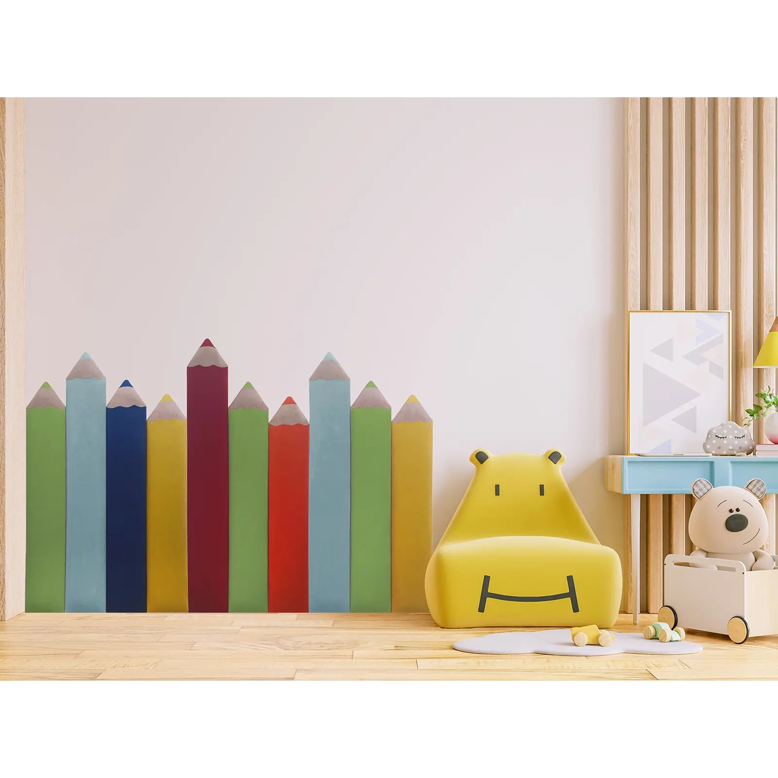 • Miękkie i bezpieczne panele w kształcie kolorowych kredek, idealne do pokoju dziecięcego i sal edukacyjnych.