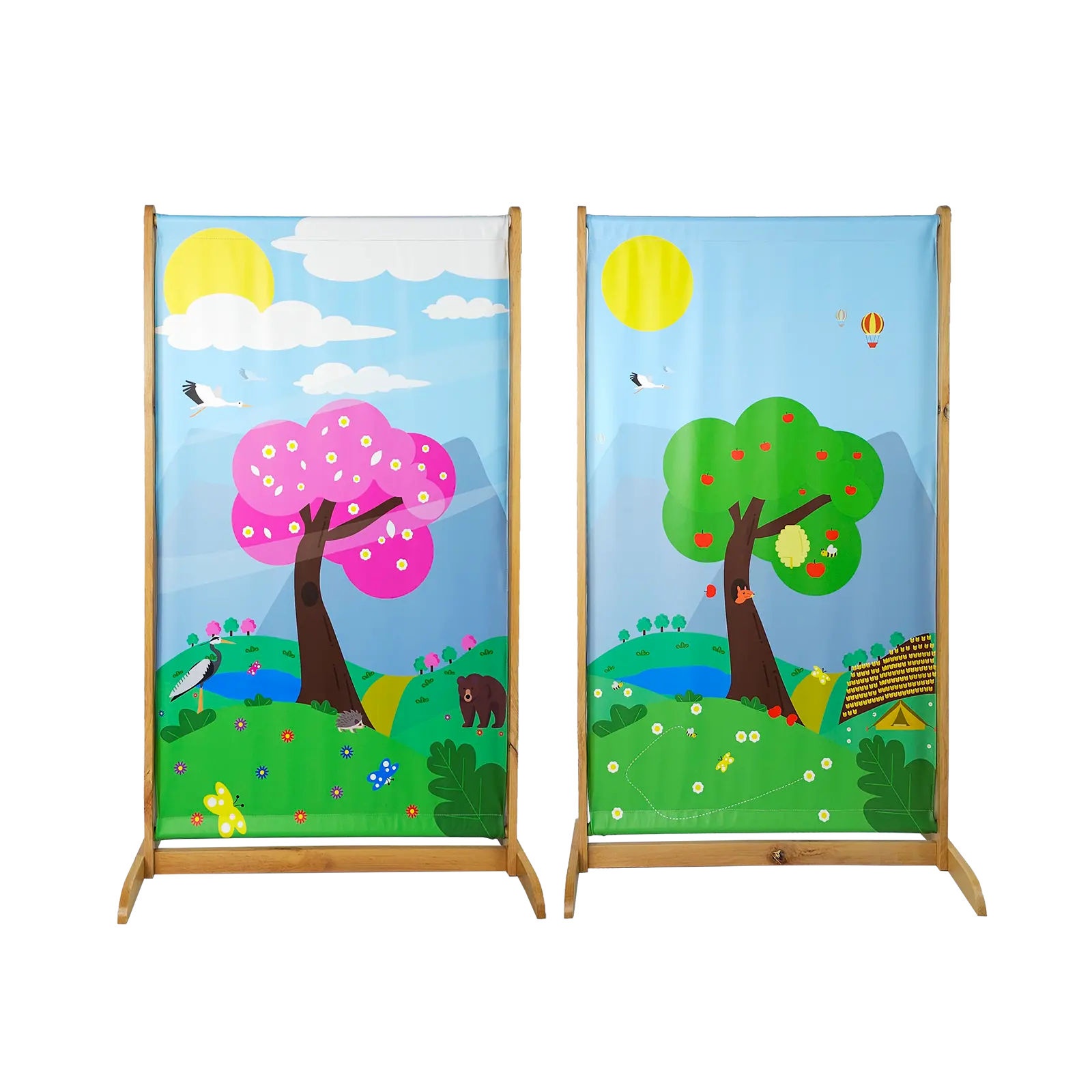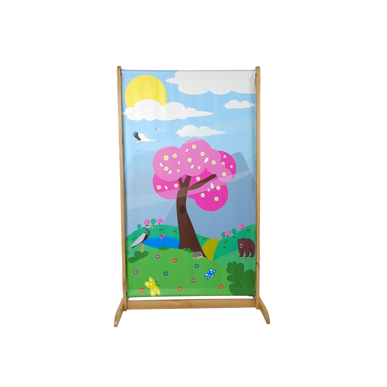 Parawan dwustronny WIOSNA-LATO może służyć do podziału pomieszczenia lub jako dekoracja. Doskonale sprawdzi się przy tworzeniu dziecięcych kącików w salach przedszkolnych oraz innych miejscach przeznaczonych dla dzieci. Piękne, kolorowe parawany na drewnianym stojaku doskonale nadają się do sali przedszkolnej, żłobka czy klubu malucha. Dostępne w wersji wiosna-lato i jesień-zima – świetnie ożywią każde pomieszczenie.