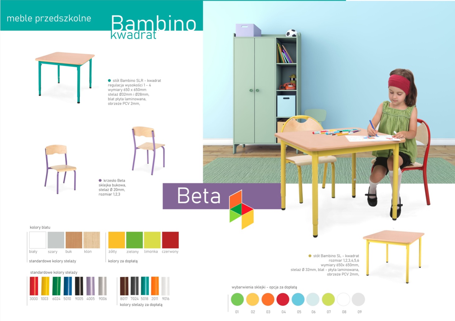 Stół przedszkolny Bambino posiada atest zgodny z normami PN-EN1729-1:2016; PN-EN 1729-2+A1:2016