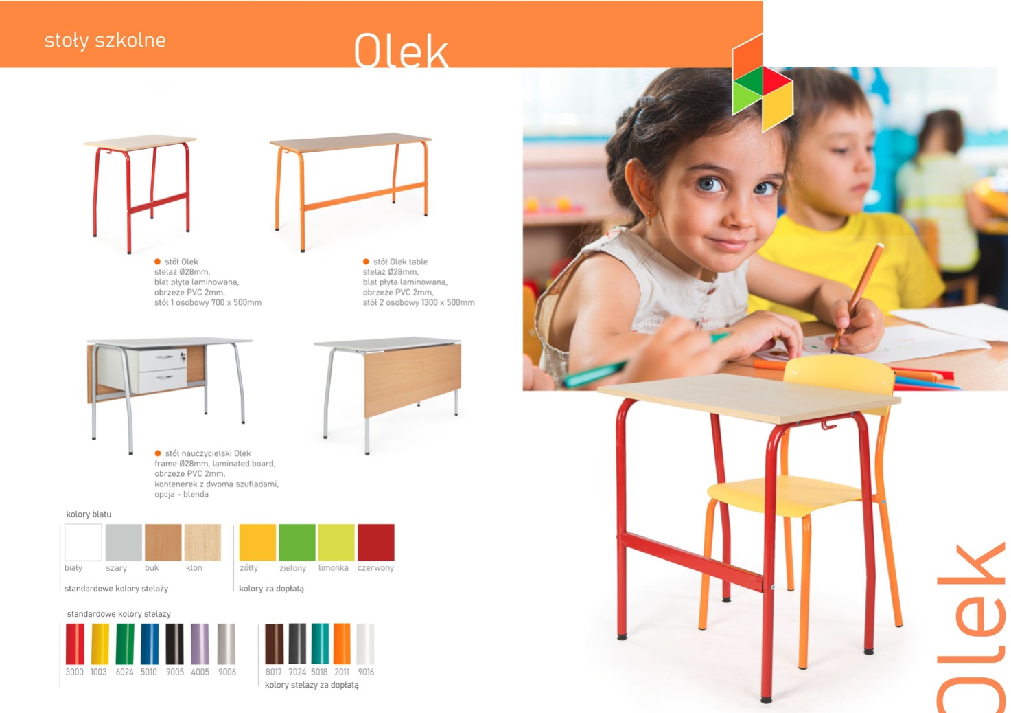 Stół przedszkolny OLEK występuje w wariantach: 1-osobowy (wymiar blatu 700x500mm), 2-osobowy (wymiar blatu 1300×500 mm).