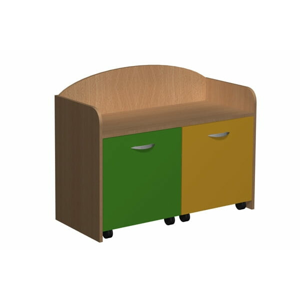 - Regał posiadający na dole dwa pojemniki na kółkach.