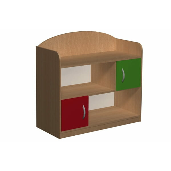 - Niska szafka posiadająca 2 kwadratowe skrytki zamykane drzwiczkami i 2 szerokie wnęki