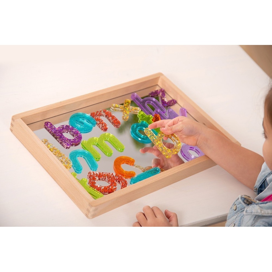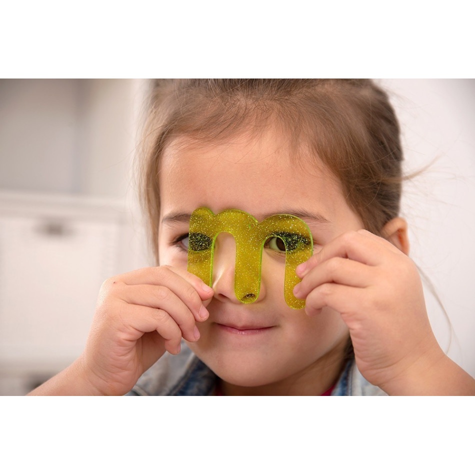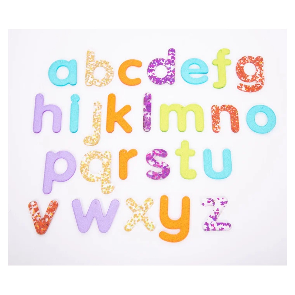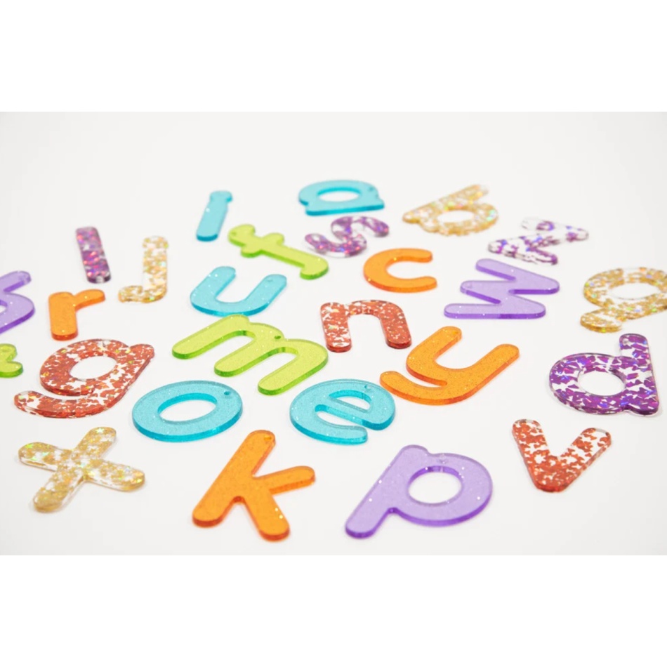 Zestaw 26 błyszczących, brokatowych małych liter a-z w przyjaznej dla dzieci czcionce wykonanej z kolorowego, półprzezroczystego akrylu o grubości 3 mm. Litery są dostępne w 7 kolorach, a samogłoski w kolorze turkusowym. Idealne do użycia na panelu świetlnym, aby rozpoznawanie liter było interesujące i ekscytujące. Litery mają 2,5 mm otwór w górnym punkcie równowagi, dzięki czemu można je zawiesić na oknie lub na zewnątrz, tworząc fascynujące kolorowe brokatowe cienie.