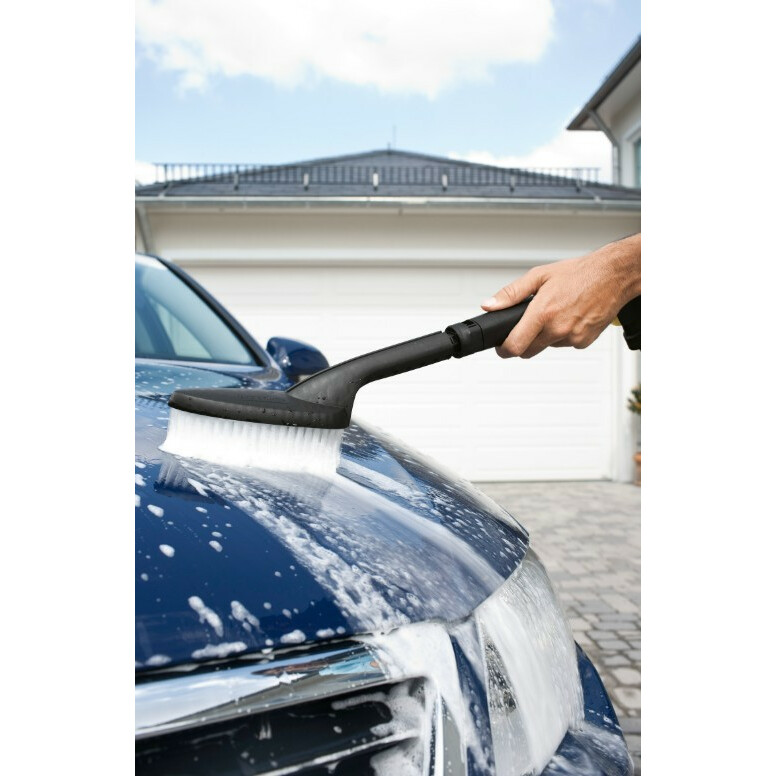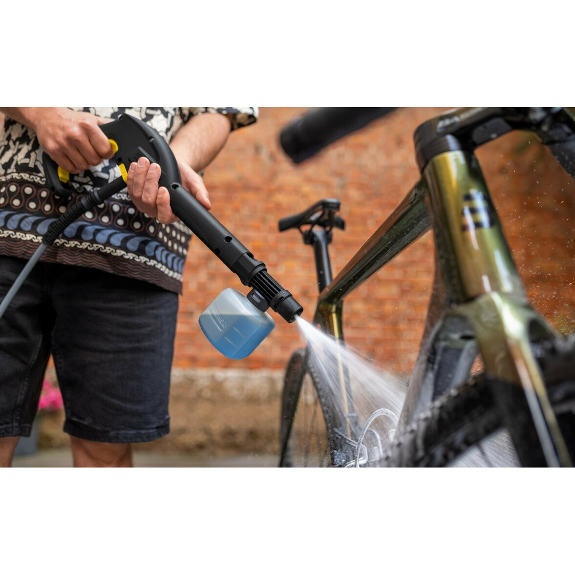 • W zestawie praktyczne akcesoria, takie jak dysza pianowa, pistolet wysokociśnieniowy, szczotka do mycia i szampon samochodowy.