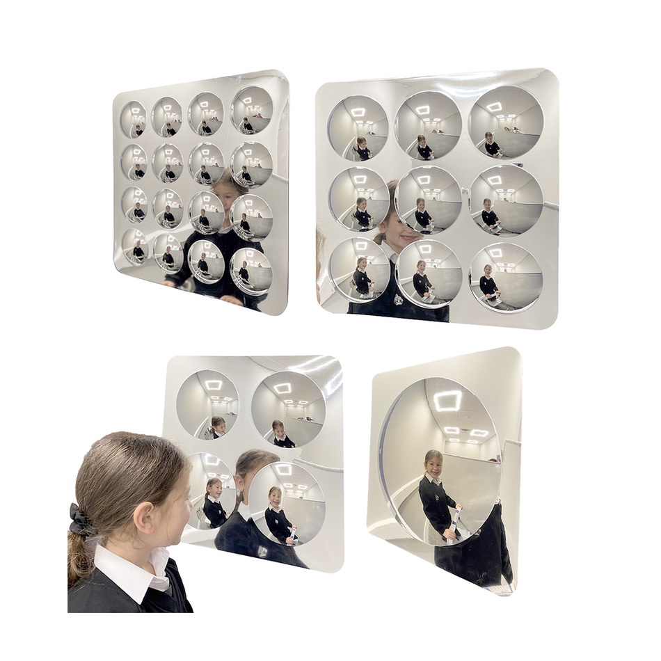 Zestaw 4 dużych wypukłych lusterek sensorycznych z zestawem różnej wielkości bąbelków, z których każdy tworzy inny obraz. Rozbudzają ciekawość i zachęcają dzieci do odkrywania i stawania się bardziej świadomymi siebie. Zestaw zawiera 1 dużą bańkę, 4 bańki, 9 baniek i 16 baniek. (tylko do użytku w pomieszczeniach).