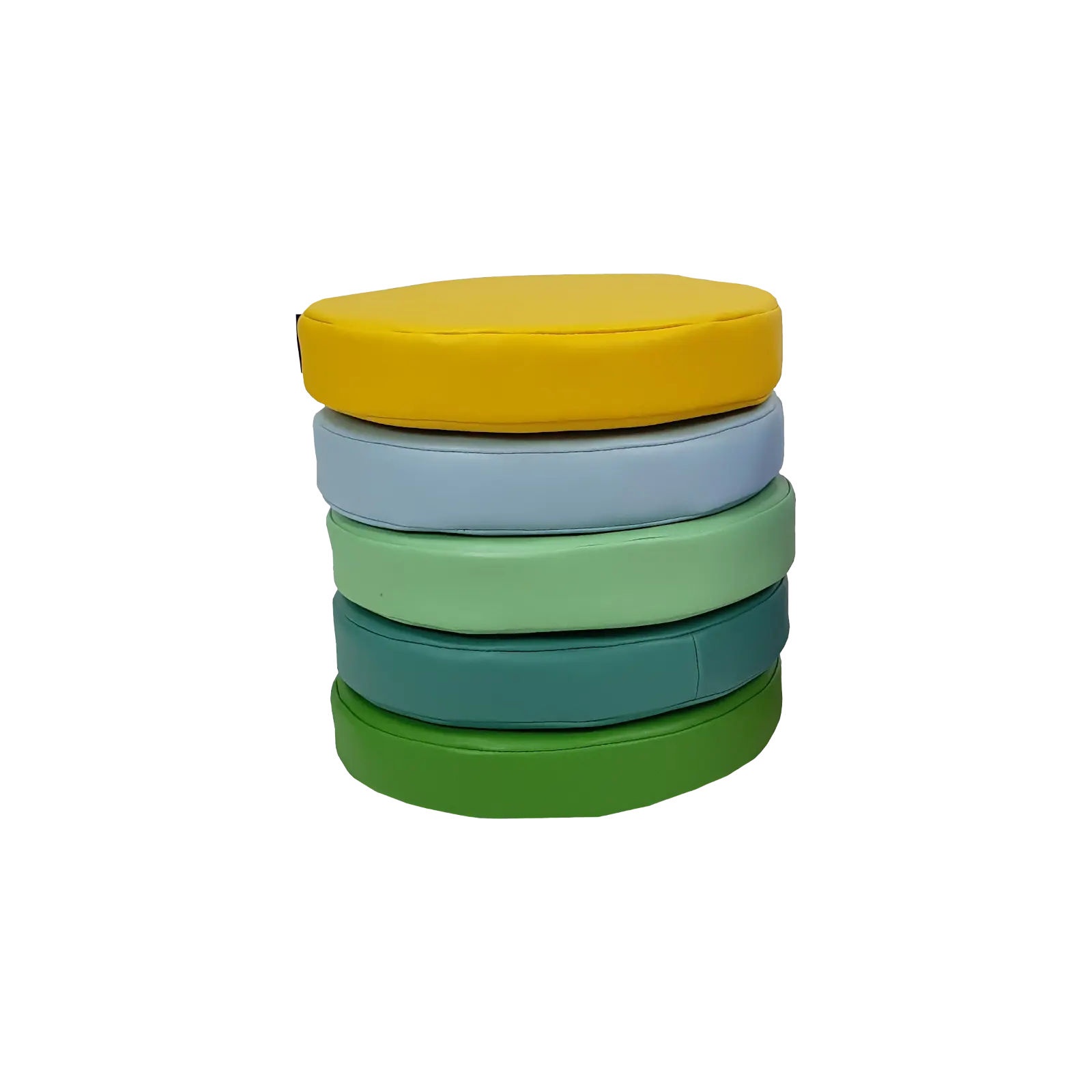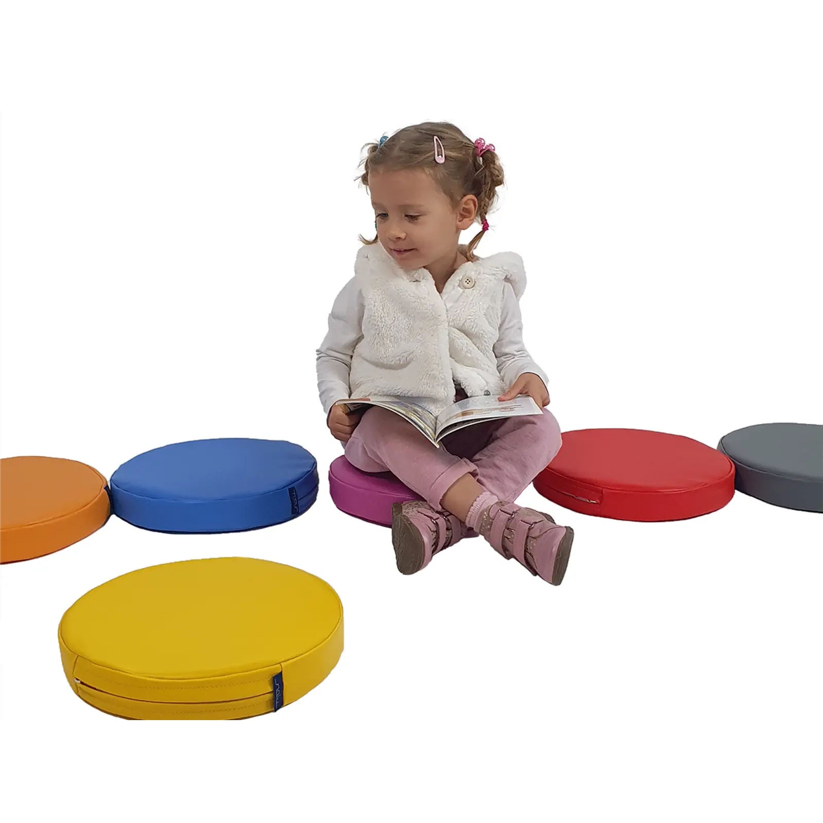Zestaw klocków piankowych – Poduszki okrągłe to zestaw 5 wygodnych, kolorowych siedzisk podłogowych. Każda poduszka wypełniona jest pianką poliuretanową, która zapewnia wygodę siedzenia podczas zajęć, zabawy lub odpoczynku. Pokrowiec wykonany jest materiału najwyższej jakości z powłoką PCV przeznaczonego dla wyrobów medycznych, dzięki czemu jest bardzo łatwy w czyszczeniu oraz dezynfekcji. Produkt posiada certyfikację jako wyrób medyczny.