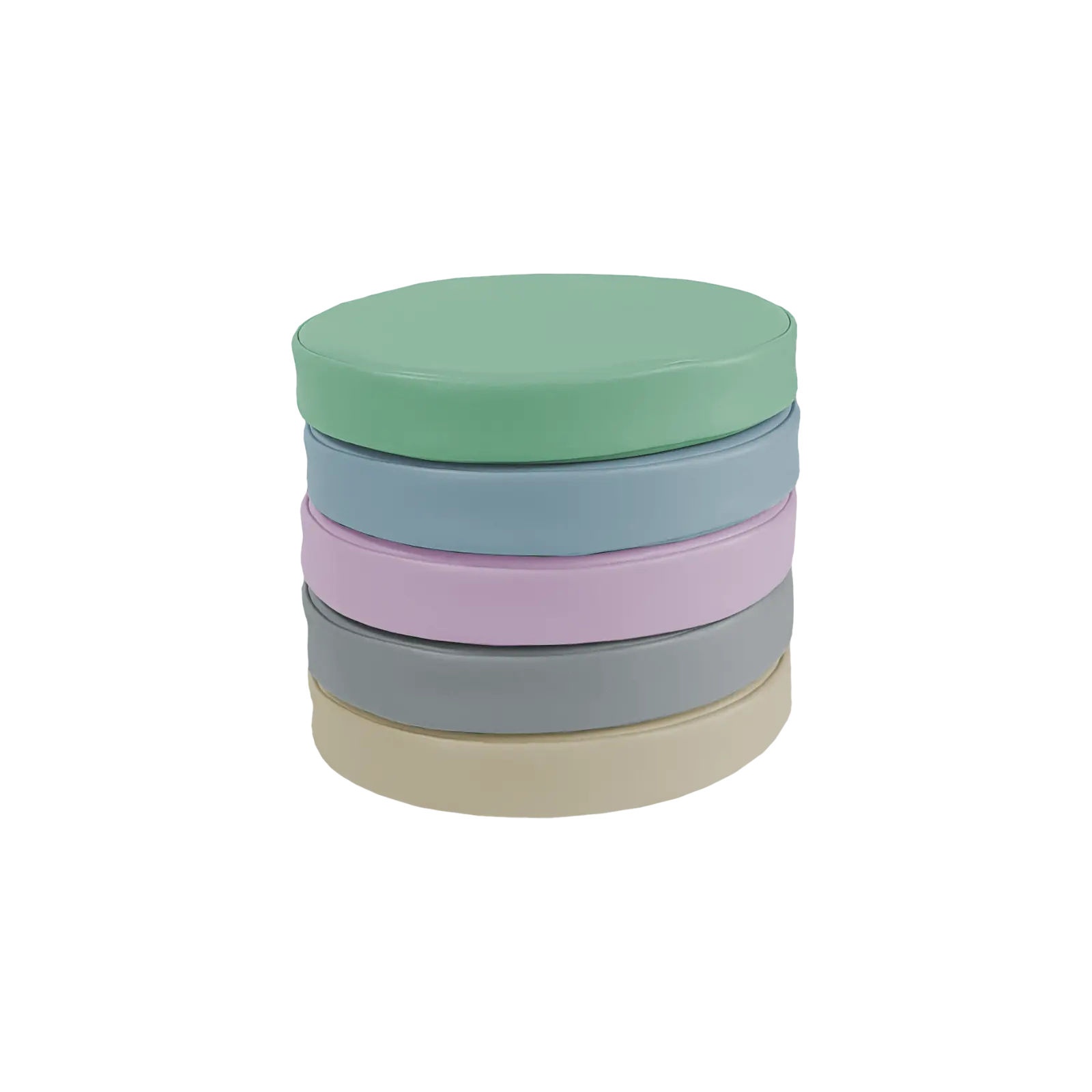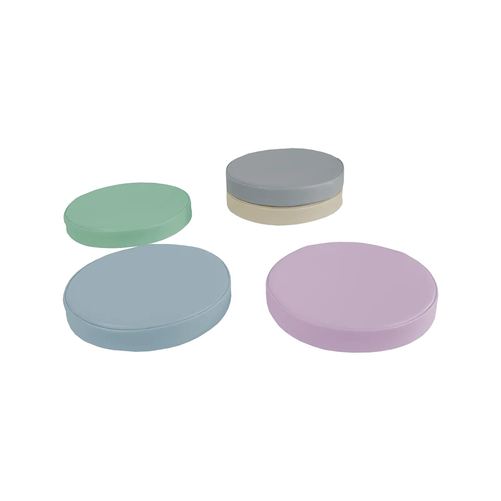 Zestaw klocków piankowych – Poduszki okrągłe to zestaw 5 wygodnych, siedzisk podłogowych w pastelowych kolorach. Każda poduszka wypełniona jest pianką poliuretanową, która zapewnia wygodę siedzenia podczas zajęć, zabawy lub odpoczynku. Pokrowiec wykonany jest materiału najwyższej jakości z powłoką PCV przeznaczonego dla wyrobów medycznych, dzięki czemu jest bardzo łatwy w czyszczeniu oraz dezynfekcji. Produkt posiada certyfikację jako wyrób medyczny.