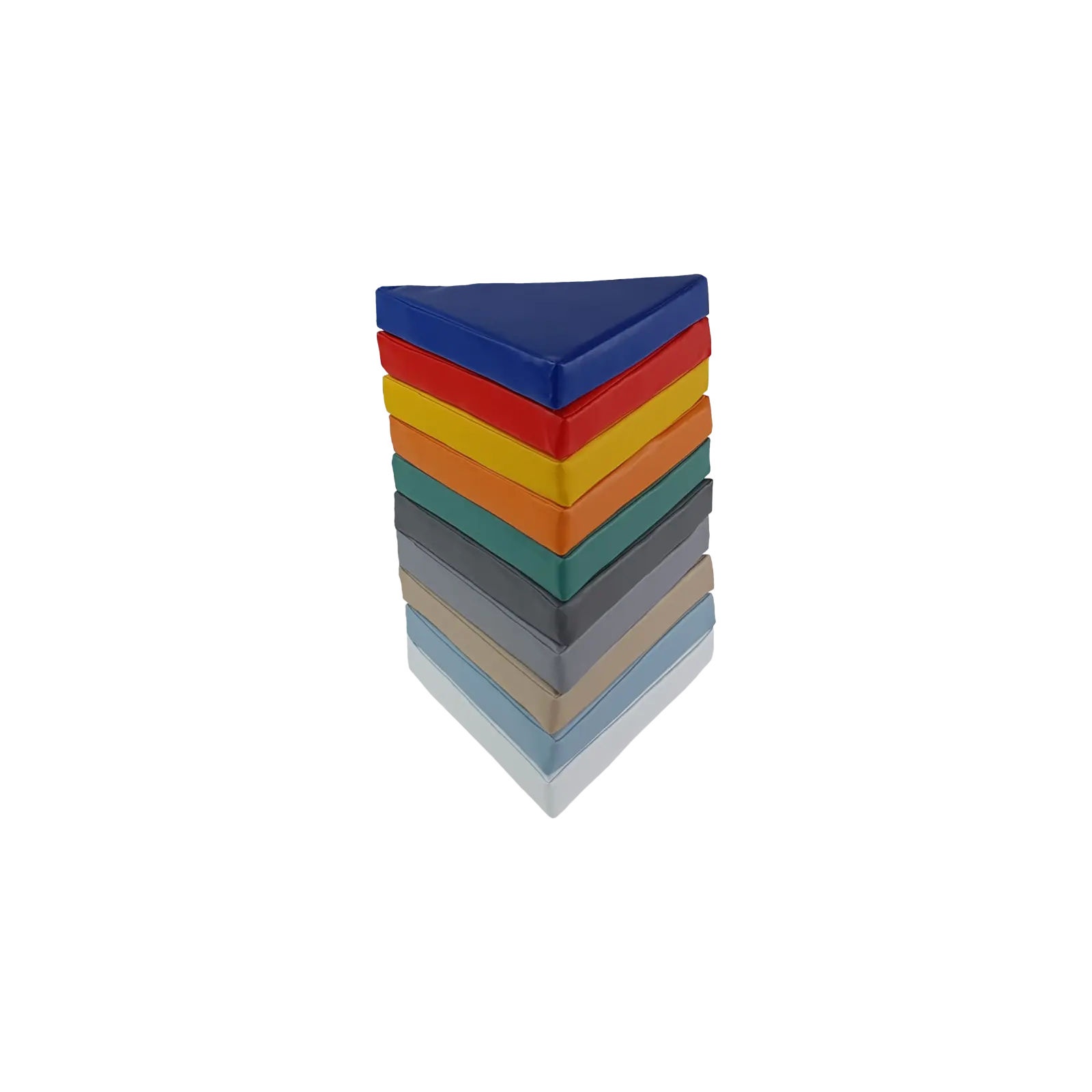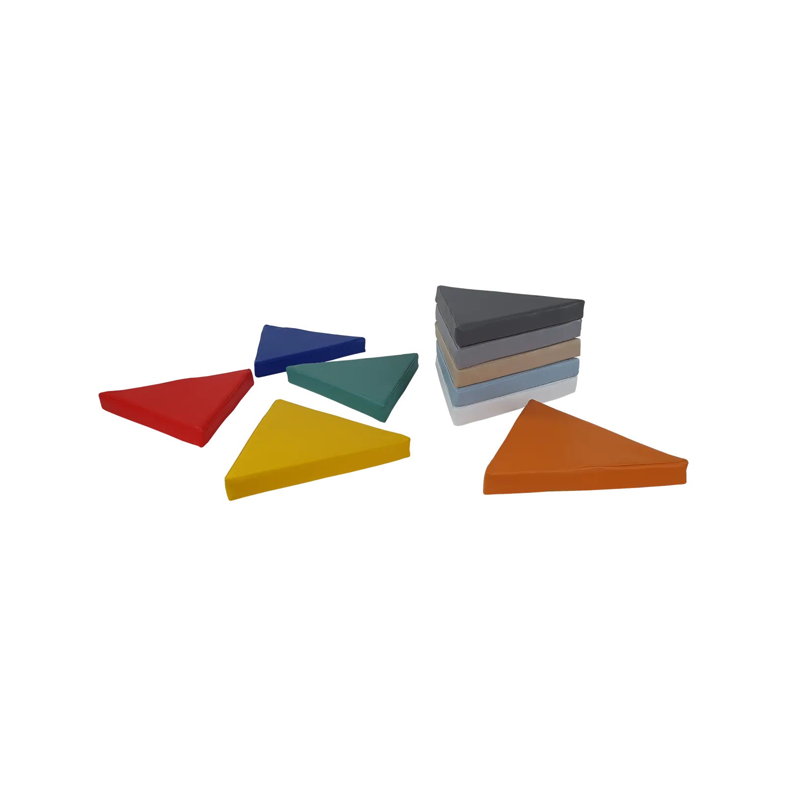 Zestaw klocków piankowych – Poduszki trójkątne to zestaw 10 wygodnych, kolorowych siedzisk podłogowych. Każda poduszka wypełniona jest pianką poliuretanową, która zapewnia wygodę siedzenia podczas zajęć, zabawy lub odpoczynku. Pokrowiec wykonany jestz materiału najwyższej jakości z powłoką PCV przeznaczonego dla wyrobów medycznych, dzięki czemu jest bardzo łatwy w czyszczeniu oraz dezynfekcji. Produkt posiada certyfikację jako wyrób medyczny.