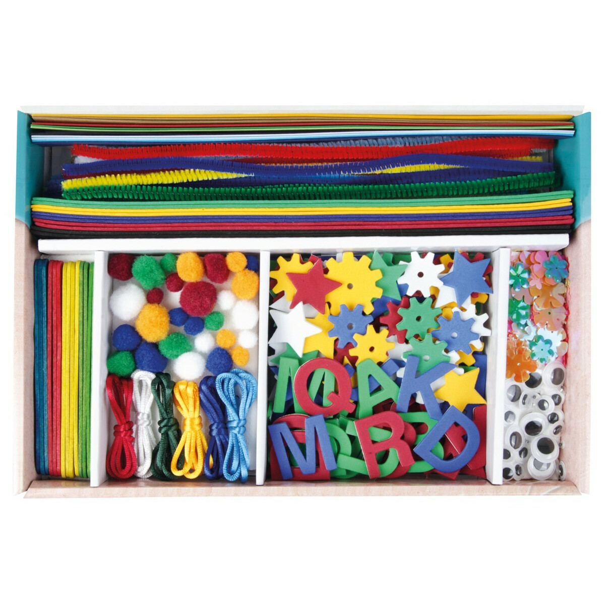 Zestaw zawiera kolorowe papiery, części z pianki gumowej, patyczki, oczy, pompony, guziki i wiele więcej.