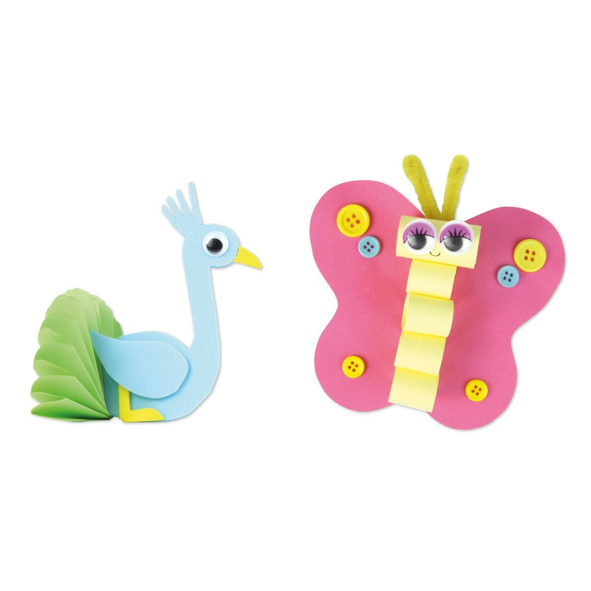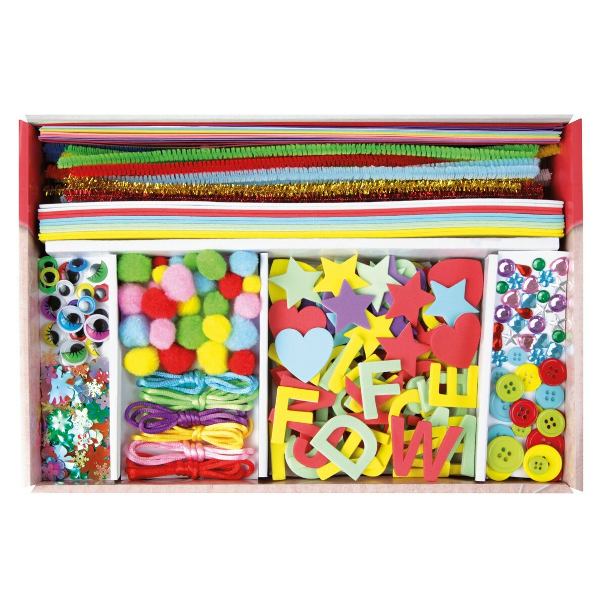 • Zestaw zawiera 400 elementów, w tym kolorowe papiery, piankę gumową, patyczki, oczy, pompony i guziki.