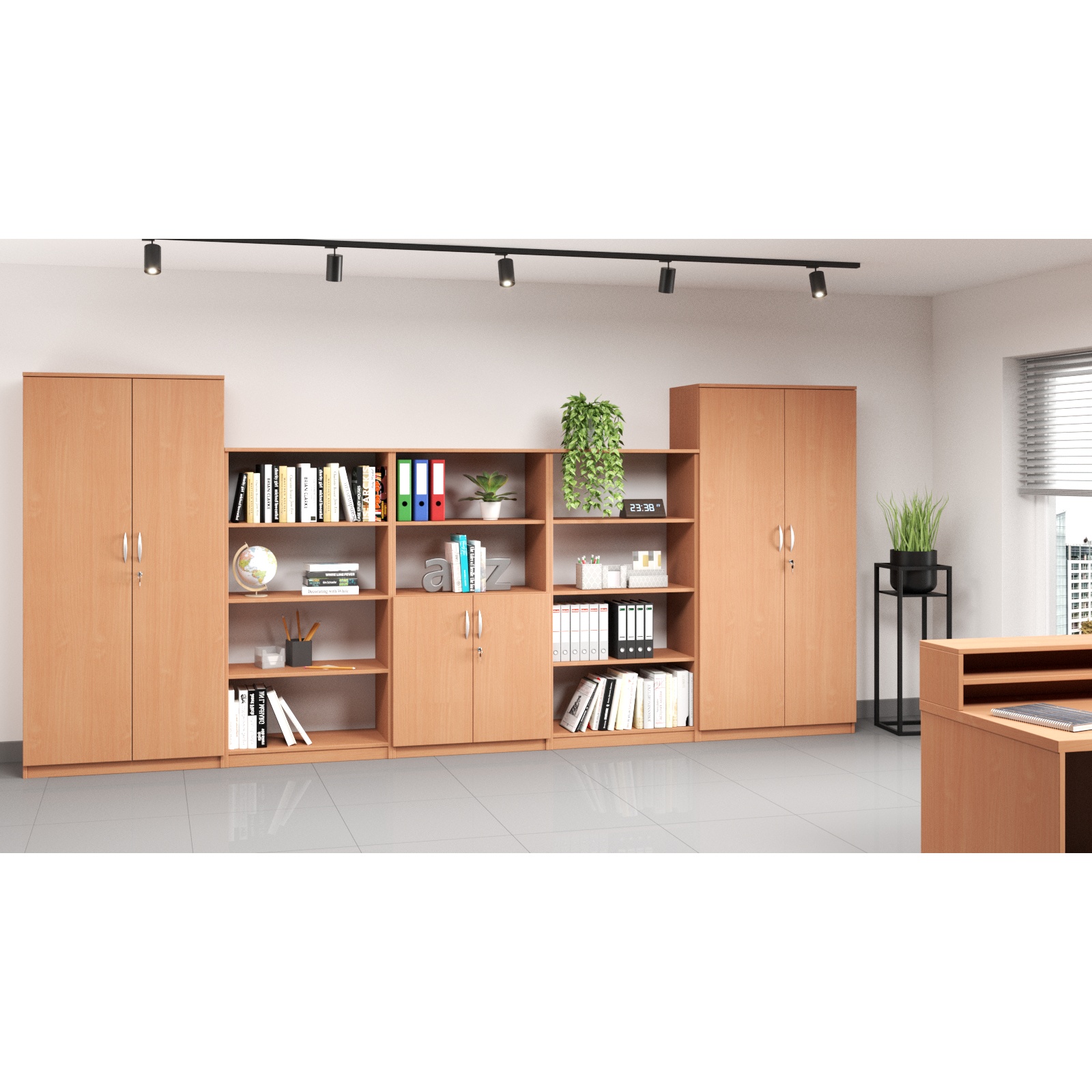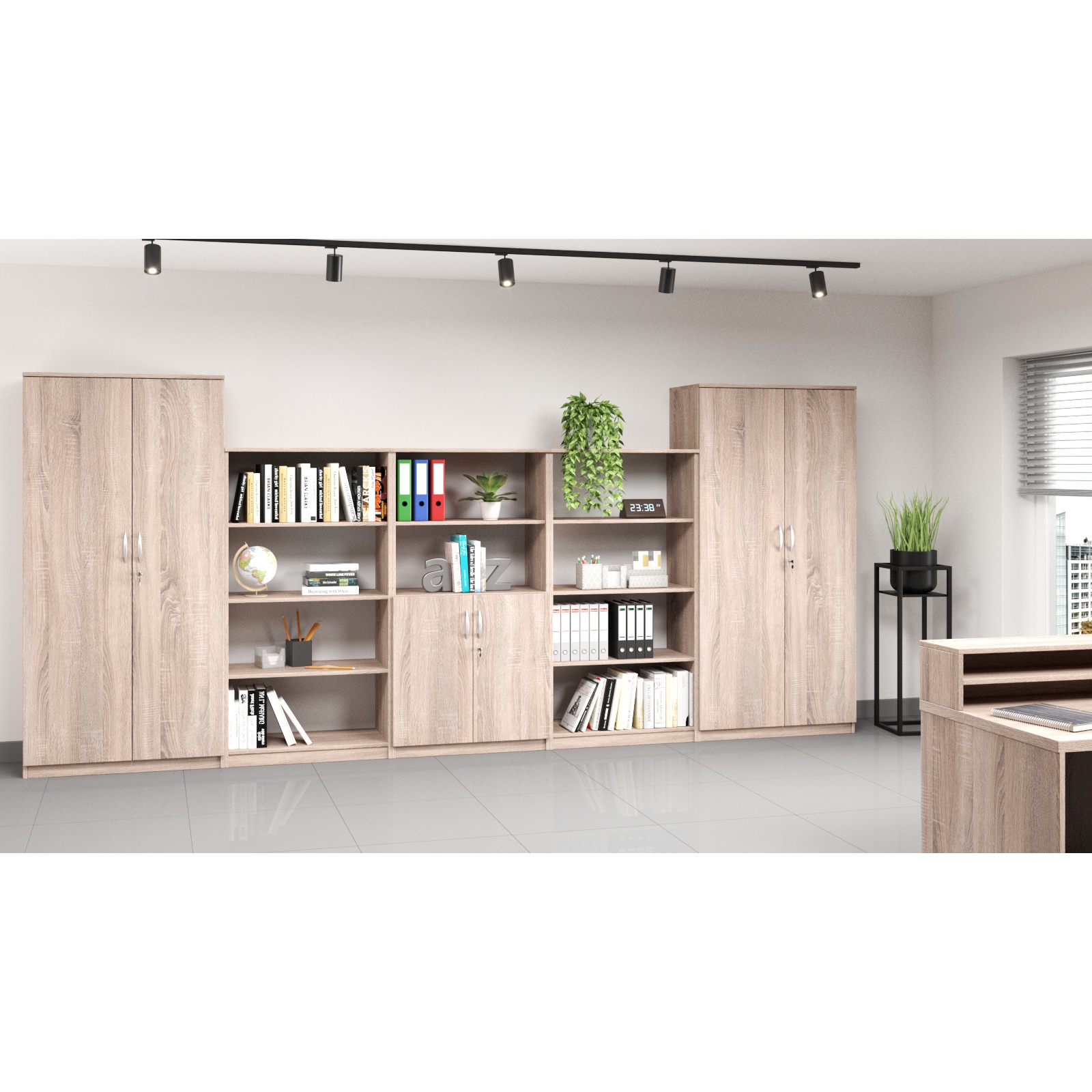 * Od lewej: Mazur 19 Wymiar (WxSxG) 1850x800x400 mm. Wykonana z płyty laminowanej 18 mm. Posiada 5 przestrzeni na dokumenty. Drzwi zamykane na zamek z 2 kluczykami. Istnieje możliwość zamontowania zamków z system klucza MASTER. Metalowe uchwyty.