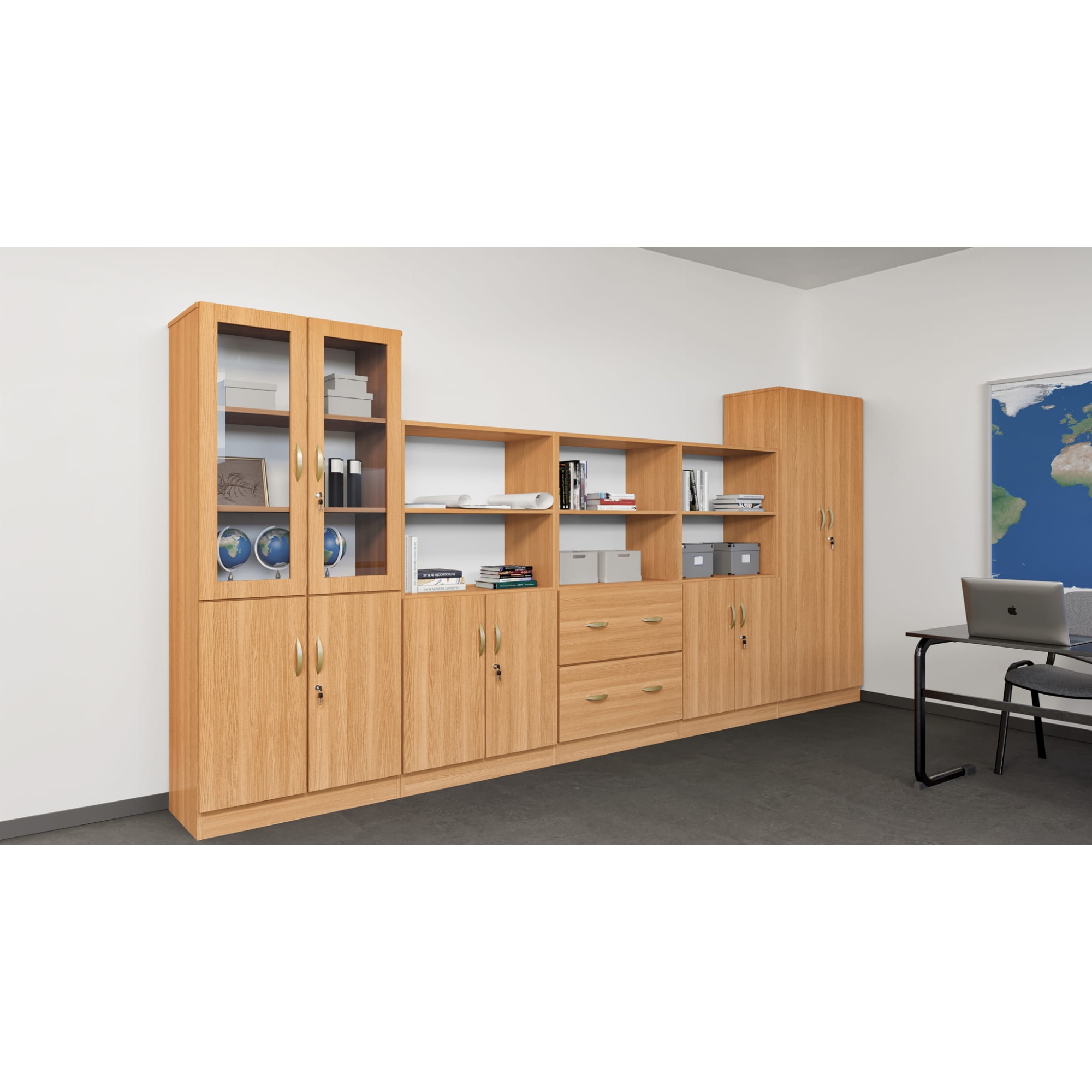 * Od lewej: Mazur 26 Wymiar (WxSxG) 1850x800x400 mm. Wykonana z płyty laminowanej 18 mm. Posiada 5 przestrzeni na dokumenty. Trzy górne zamykane drzwiami z witryną i dwie dolne pełnymi drzwiami. Drzwi zamykane na zamek z 2 kluczykami. Istnieje możliwość zamontowania zamków z system klucza MASTER. Metalowe uchwyty.