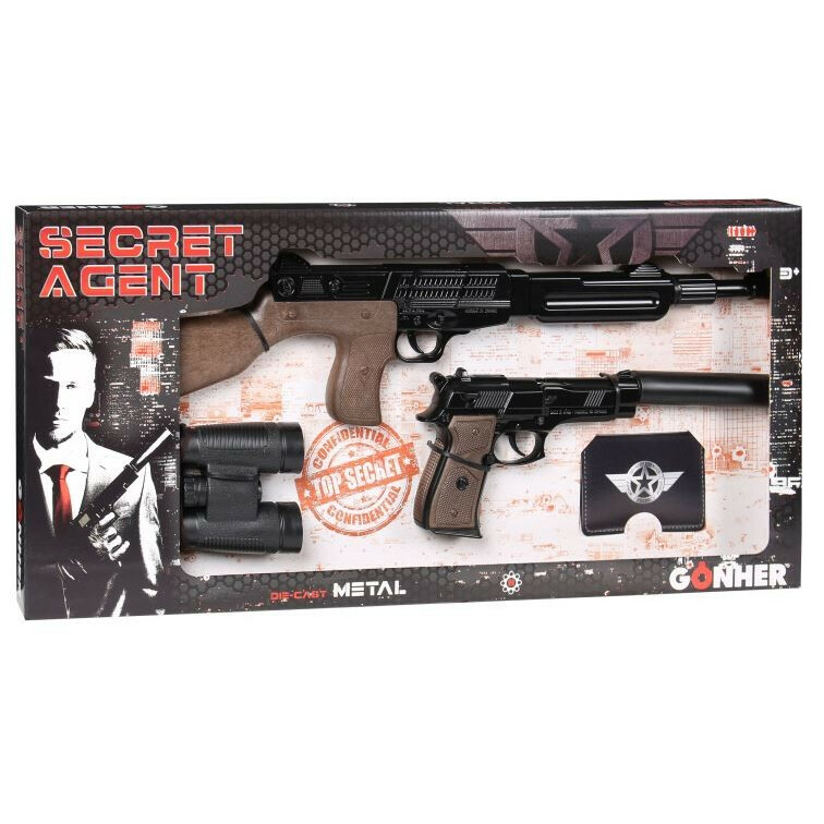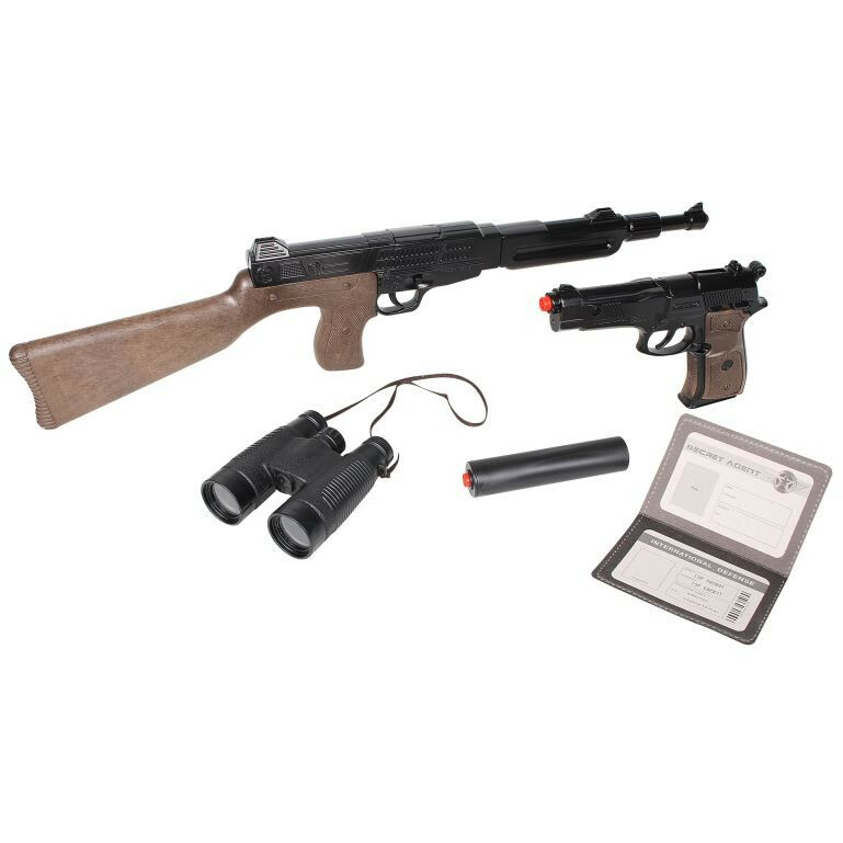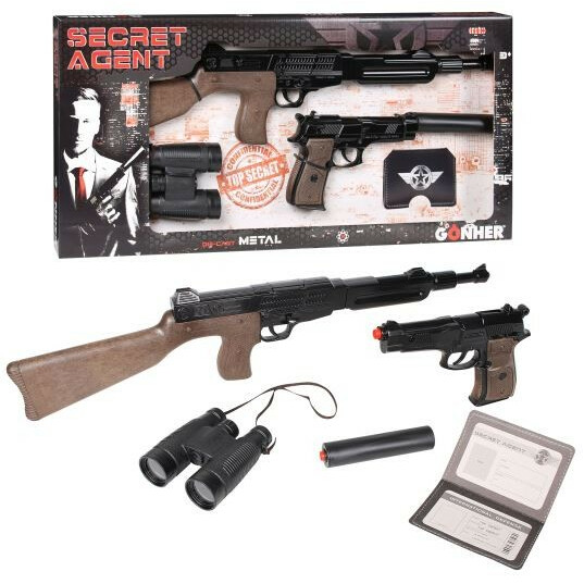 Zestaw zawiera: metalowy karabin i pistolet na 8 naboi z magazynkiem, lornetkę oraz legitymację tajnego agenta. Wiek: 3+.